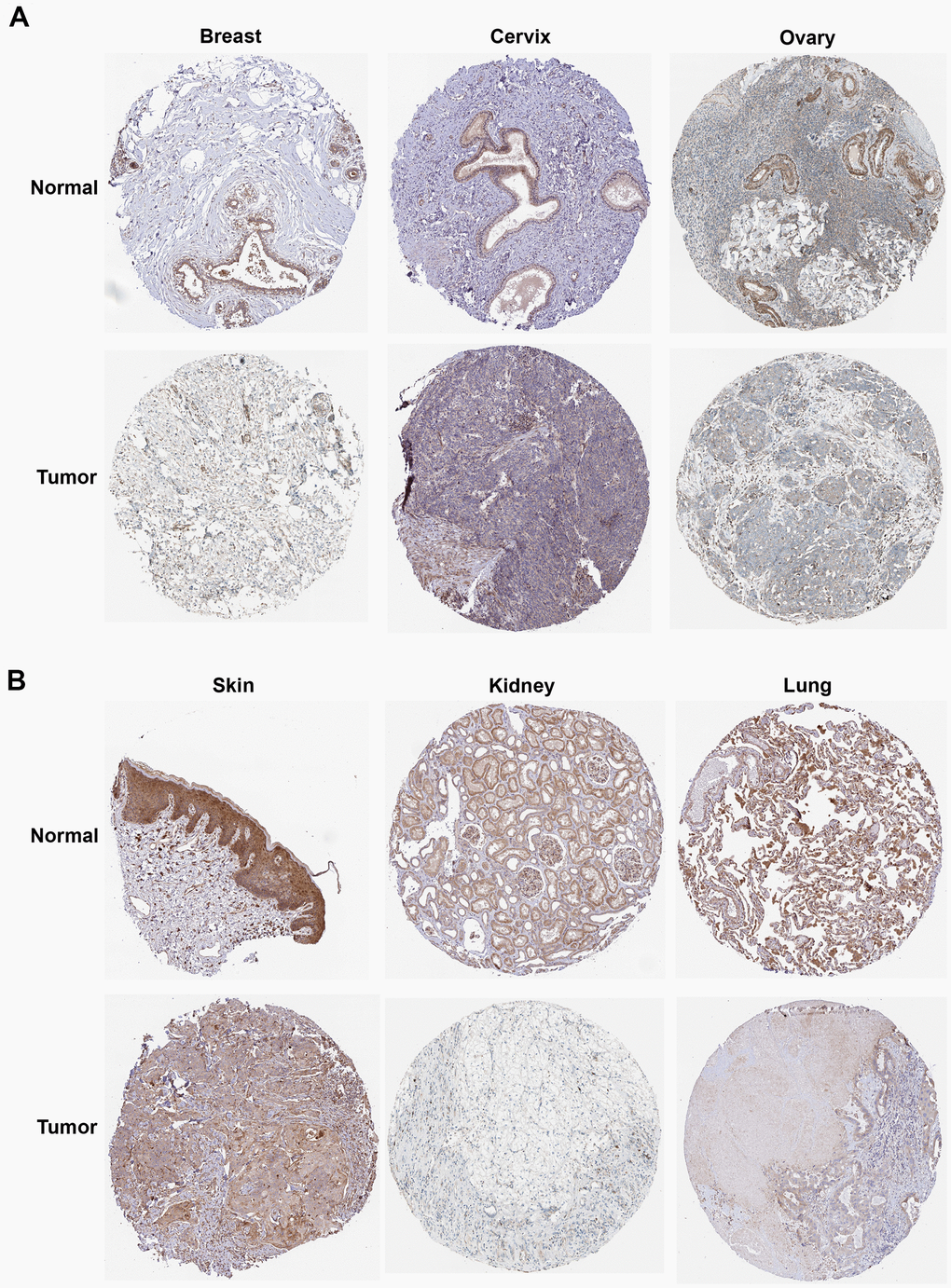 We then calculated the difference in expression between normal and tumor samples in each tumor. In TCGA datasets of 26 tumors, eight tumors showed significantly higher expression, including Glioma (GBMLGG), Brain Lower Grade Glioma (LGG), Stomach and Esophageal carcinoma (STES), Stomach adenocarcinoma (STAD), Head and Neck squamous cell carcinoma (HNSC), Kidney renal clear cell carcinoma (KIRC), Liver hepatocellular carcinoma (LIHC), and Cholangiocarcinoma (CHOL), while the expression of ROCK1 in 10 tumors was lower than normal controls: Lung adenocarcinoma (LUAD), Colon adenocarcinoma/Rectum adenocarcinoma Esophageal carcinoma (COADREAD), Breast invasive carcinoma (BRCA), Kidney renal papillary cell carcinoma (KIRP), Prostate adenocarcinoma (PRAD), Uterine Corpus Endometrial Carcinoma (UCEC), Lung squamous cell carcinoma (LUSC), Rectum adenocarcinoma (READ), Bladder Urothelial Carcinoma (BLCA), and Kidney Chromophobe (KICH) (Figure 12A). To further validate the results, we add normal control data from GTEx datasets and perform difference analysis combined with TCGA and GTEx. As shown in Figure 12B, ROCK1 in 13 types of tumors was highly expressed: GBM(p=4.8E-12), GBMLGG(p=1.3E-73), LGG(p=1.5E-74), Esophageal carcinoma (ESCA)(p=2.9E-05), STES(p=4.0E-05), STAD(p=8.0E-22), HNSC(p=2.8E-07), KIRC(p=2.6E-06), High-Risk Wilms Tumor (WT)(p=5.1E-22), Pancreatic adenocarcinoma (PAAD)(p=7.7E-40), Acute Lymphoblastic Leukemia (ALL)(p=9.1E-44), Acute Myeloid Leukemia (LAML)(p=3.1E-74), CHOL(p=1.6E-05), and totally 18 cancers were low-ROCK1 expression: UCEC(p=5.1E-05), BRCA(p=3.0E-46), Cervical squamous cell carcinoma and endocervical adenocarcinoma (CESC)(p=7.7E-06), LUAD(p=8.4E-90), KIRP(p=2.7E-15), Colon adenocarcinoma (COAD)(6.8E-40), COADREAD(p=7.9E-47), PRAD(p=4.3E-16), LUSC(p=3.5E-103), Skin Cutaneous Melanoma (SKCM)(p=7.3E-24), BLCA(p=3.1E-08), Thyroid carcinoma (THCA)(p=1.5E-56), READ(p=0.02), Ovarian serous cystadenocarcinoma (OV)(p=6.8E-40), Testicular Germ Cell Tumors (TGCT)(p=3.0E-15), Uterine Carcinosarcoma (UCS)(p=1.6E-22), Adrenocortical carcinoma (ACC)(p=3.0E-24), KICH(p=2.6E-04). According to the results, we found that the tumors in the central nervous system (GBM and LGG), in the digestive tract (STAD, LIHC, CHOL, ESCA, PAAD), and the hematological malignancies including ALL and LAML had a higher level of ROCK1 expression significantly. Interestingly, consistent with the low expression of ROCK1 in PMOP, ROCK1 was down-regulated in all women’s tumors (BRCA, UCEC, CESC, OV, and UCS) in the database. Moreover, lung cancers (LUAD, LUSC) and tumors in the large intestine (COADREAD, READ, and COAD) also had a lower expression of ROCK1 than the normal tissues. However, the ROCK1 level in bone-related tumors like osteosarcoma is similar to the normal tissues. To further validate the results in protein level, the protein expression level of ROCK1 from HPA was consistent with the mRNA results, both in women-specific cancers (Figure 13A) and the skin cancers, renal cancers, and lung cancers (Figure 13B) which were mentioned above. We selected patients who is woman and at the age of postmenopause, the details of patient information were shown in Supplementary Table 2.