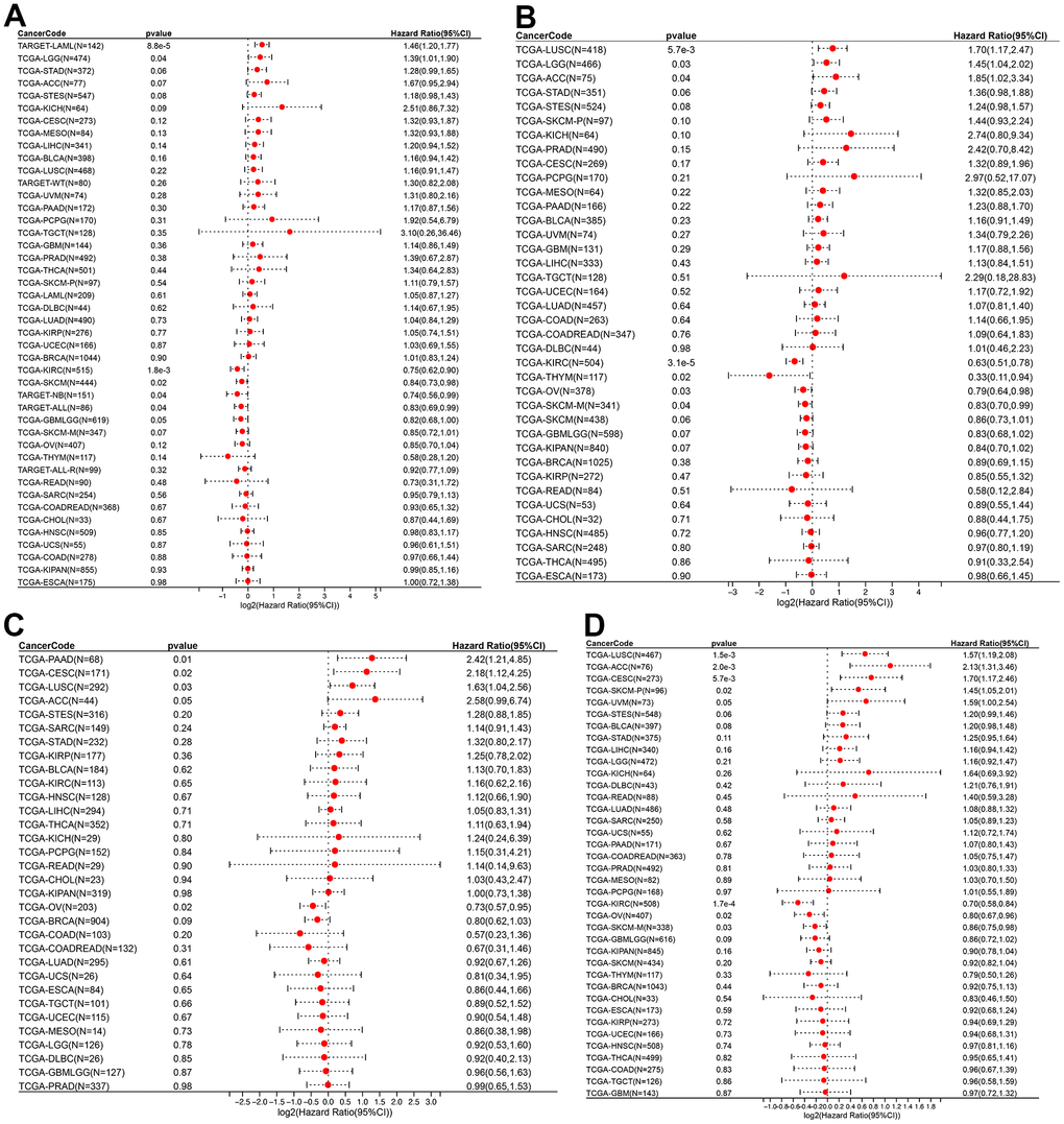 A total of 44 cancer species were eventually acquired for investigation after cancer species with fewer than 10 samples in each cancer species were excluded from the data set. We created a Cox proportional hazards regression model using the “coxph” function of the R package “survival” to examine the correlation between gene expression and prognosis in each tumor. The log-rank test was utilized as a statistical test to determine the prognostic significance.