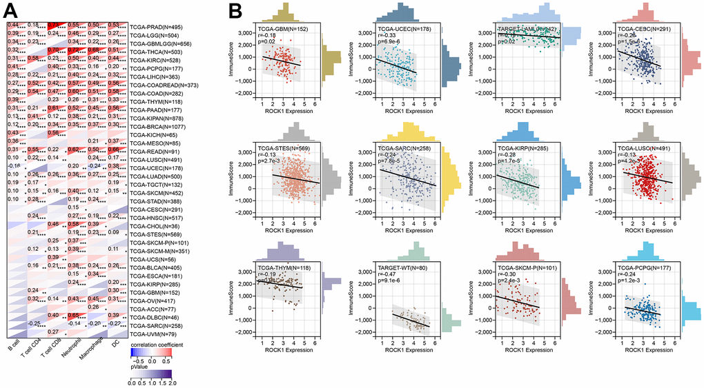 Using TIMER, six immune cell infiltration scores were obtained for 9406 tumor samples from 38 tumor types. Moreover, the immune infiltration score with a significant correlation was determined using Pearson’s correlation coefficient of gene and immune cell infiltration scores in each tumor. The full results were shown in Figure 15A. To further validate the TIMER results, we then perform ESTIMATE immune score analysis and find immune scores in 12 types of tumors (GBM, UCEC, LAM, CESC, STES, SARC, KIRP, LUSC, THYM, WT, SKCM-P, and PCPG) were negatively correlated to the ROCK1 expression levels (Figure 15B).