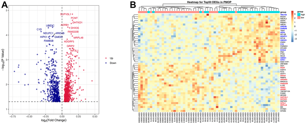 After removing batch effects, mRNA expression levels in Peripheral blood mononuclear cells (PBMC) were obtained from PMOP patients and healthy controls in two GEO datasets (GSE56815 and GSE7429). The screening criteria of DEGs was |log2(fold change) |≥ 0 and adjusted p value< 0.05 [24]. Totally 1278 DEGs were identified with 715 up-regulated genes and 563 down-regulated genes. Sorted by the values of log2(fold change), the top 10 up-regulated genes were SUPV3L1, PCNT, DHTKD1, ADRB1, DHX35, FAM222B, MRPL48, ADGRF5, GRIP2, and NIF3L1 while the top 10 down-regulated genes were KCNJ2, TBC1D2, ATP5l, UBE3C, C1D, ARID4B, NDUFC1, GMEB1, HIPK1, and FAM65B. Volcano plot (Figure 2A) visualized the results. Both top 10 up-regulated and down-regulated genes are highlighted in the heatmap (Figure 2B).