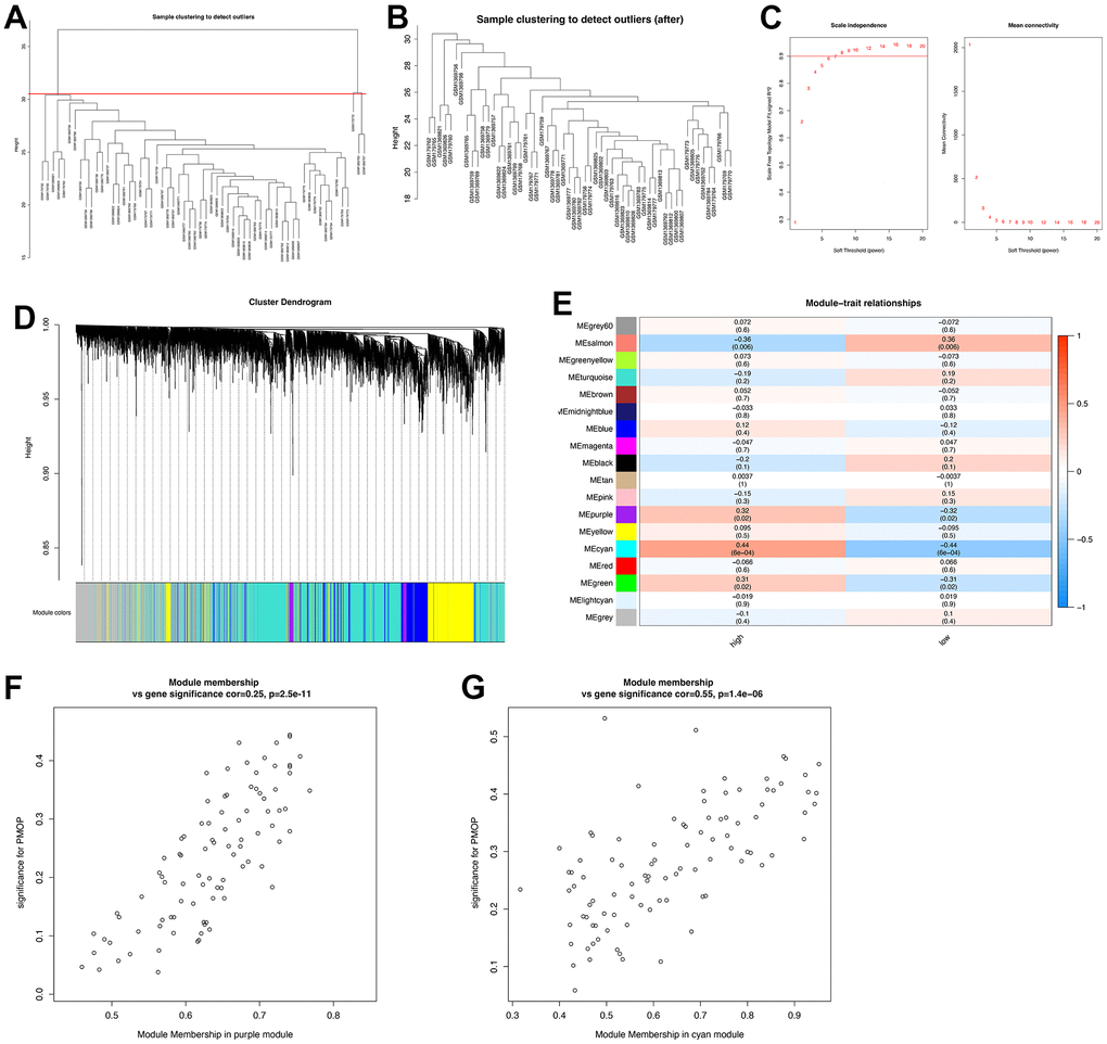 A total of 58 samples (30 PMOP patients and 28 healthy controls) were included in the WGCNA after clustering and excluding two outliers with the cut-off value =31 (Figure 3A, 3B). Depending on the curve of scale independence, the soft threshold was set to 7 when R2 >0.9 and the mean connectivity remained low (Figure 3C). Cluster Dendrogram was constructed, and 18 modules were identified with different features (Figure 3D). Then we explore the relationship between modules and clinical groups (high BMD and low BMD) to find the key module genes that may correlate greatly with PMOP. As shown in Figure 3E, the salmon module had a positive association with PMOP (r =0.36, p= 0.006) while the purple module (r =-0.32, p= 0.02), the cyan module (r= -0.44, p= 6E-04), and the green module (r= -0.31, p= 0.02) were negatively correlated with PMOP. Among the four modules, the purple module (cor=0.25, p=2.5e-11) and cyan module (cor=0.55, p=1.4e-06) showed a great correlation with PMOP in the MM versus GS scatterplot (Figure 3F, 3G). A total of 522 genes in these two modules were selected for further analysis.