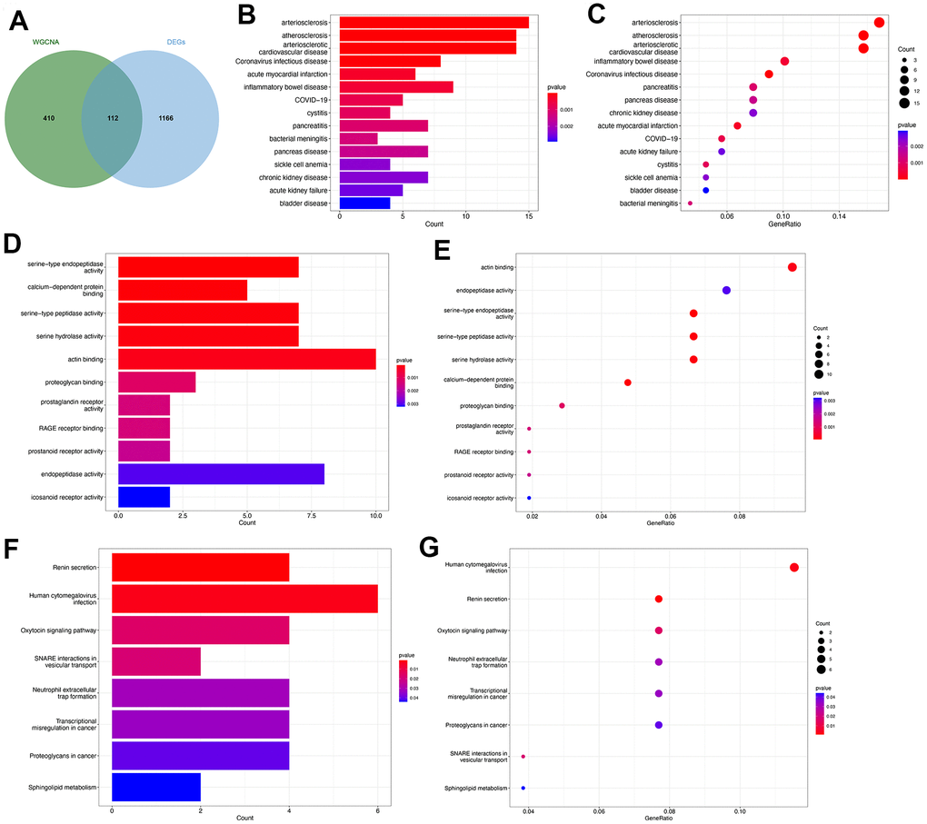 The genes identified through the employment of limma and WGCNA analyses have potential significance in the pathogenesis of PMOP. Subsequently, an intersection of the genes derived from both methods was conducted to identify key genes that exhibit consistent role in PMOP for the further analyses. We collected 522 genes from the key modules identified by WCGNA and Venn plot show a total of 112 common genes between 522 module genes and 1278 DEGs (Figure 4A). DO enrichment analysis showed the possible common genes-related diseases, including “arteriosclerosis”, “atherosclerosis”, “arteriosclerotic cardiovascular disease”, “acute myocardial infarction”, “inflammatory bowel disease”, “COVID-19”, “cystitis”, “pancreatitis”, and “bacterial meningitis” (Figure 4B, 4C). We also perform GO and KEGG functional enrichment analyses. The top five biological processes were “serine-type endopeptidase activity”, “calcium-dependent protein binding”, “serine-type peptidase activity”, “serine hydrolase activity”, and “actin binding” (Figure 4D, 4E). Pathways highly related to the 112 common genes included “Renin secretion”, “Human cytomegalovirus infection”, “Oxytocin signaling pathway”, “SNARE interactions in vesicular transport”, “Neutrophil extracellular trap formation”, “Transcriptional misregulation in cancer”, “Proteoglycans in cancer”, and “Sphingolipid metabolism” (Figure 4F, 4G). The results of GSEA for 112 common genes were visualized by ridge plots in Supplementary Figure 2A, 2B. Top three GO Cell Component (CC) contained “immunoglobulin complex circulating”, “secretory granule membrane”, and “vesicle lumen” and top three Biological Process (BP) included “respond to bacterium”, “response to molecule of bacterial origin”, and “innate immune response in mucosa” (Supplementary Figure 2A). KEGG pathway analysis by GSEA resulted in “alanine aspartate and glutamate metabolism”, “one carbon pool by folate”, and “chemokine signaling pathway” (Supplementary Figure 2B). Supplementary Figure 2C and Figure 5D were GSEA plots showing the top- and down-regulated GO terms respectively. For KEGG enrichment analysis, the top- and down-regulated pathways were also visualized by the GSEA plot (Supplementary Figure 2E, 2F).