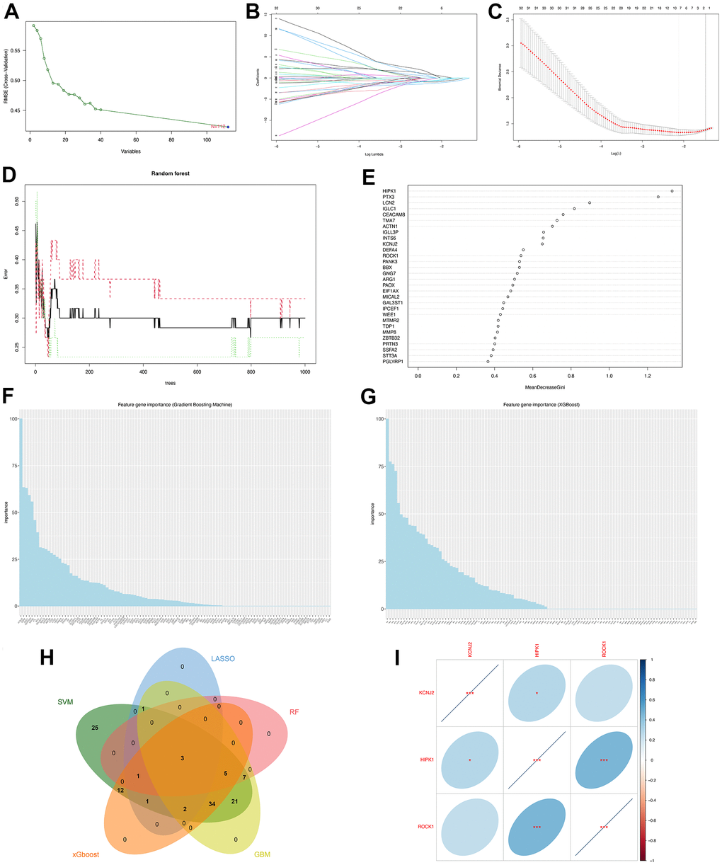 Five machine-learning algorithms were used to identify the hub genes. SVM-RFE screened 112 PMOP-related feature genes (Figure 5A). LASSO coefficient spectrum (Figure 5B) and coefficient profile (Figure 5C) show the results of LASSO regression analysis that 8 hub genes were selected. Figure 5D shows how the RandomForest algorithm correlates the mistake rate with the number of classification trees. The relative importance of 30 genes was sorted for choosing the hub genes (Figure 5E), and 16 feature genes were identified. GBM (Figure 5F) and xGBoost (Figure 5G) algorithms sorted the 112 genes by feature gene importance while 73 and 58 hub genes were screened respectively. We used a Venn plot to find the common genes between the five machine-learning methods and three hub genes (KCNJ2, HIPK2, ROCK1) were identified for further study (Figure 5H). With the hub gene expression values in PMOP, HIPK1 was positively correlated with KCNJ2 (p <0.05) and ROCK1 (p <0.001) (Figure 5I).
