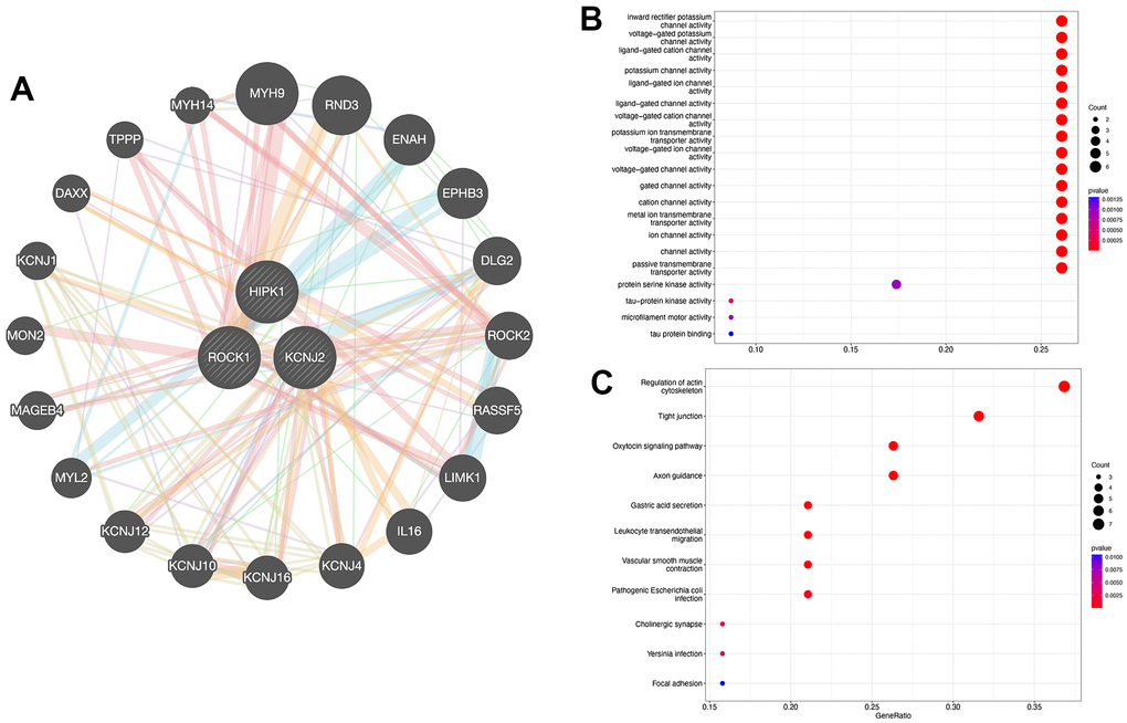 Figure 6A showed the interaction between 3 hub genes and a total of 20 highly related genes. Then we perform GO and KEGG analysis to further explore the GO terms and KEGG pathways which were enriched by the 23 genes. GO functional enrichment analysis mostly focuses on the channel activity, including “Inward rectifier potassium channel activity”, “Voltage-gated potassium channel activity”, and “Ligand-gated cation channel activity” (Figure 6B). As shown in Figure 6C, “Regulation of actin cytoskeleton”, “Tight junction”, “Oxytocin signaling pathway”, and “Axon guidance” were identified as the enriched pathways of the hub genes.