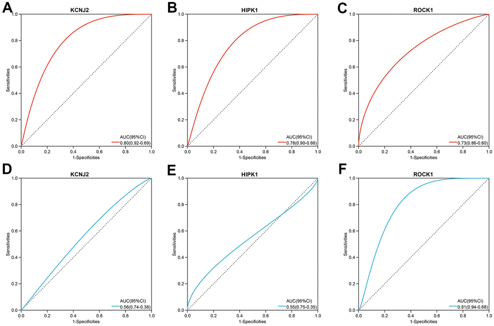 In the combined training datasets of PMOP (GSE56815 and GSE7429), the expression levels of KCNJ2, HIPK1, and ROCK1 were significantly lower in low BMD group (PMOP) than high BMD group (healthy controls) (p =1.5E-05, 2.2E-04, and 1.1E-03, respectively) (Figure 7A). We further downloaded the GSE56814 as the validation dataset, microarray analyses of monocytes from postmenopausal females with low or high BMD. Only ROCK1 showed decreased expression in PMOP group compared with controls (p =5.3E-04) (Figure 7B). Then we performed ROC analysis and calculated the AUC values to identify the diagnostic value of the hub genes. KCNJ2, HIPK1, and ROCK1 all have great abilities to diagnose PMOP in the training dataset with the AUC value >0.7 (AUC =0.80, 0.78, and 0.73, respectively) (Figure 8A–8C). However, like the same result as the expression data, the AUC value of ROCK1 was 0.81 while both KCNJ2 and HIPK1 have no significant value on PMOP diagnosis (Figure 8D–8F).