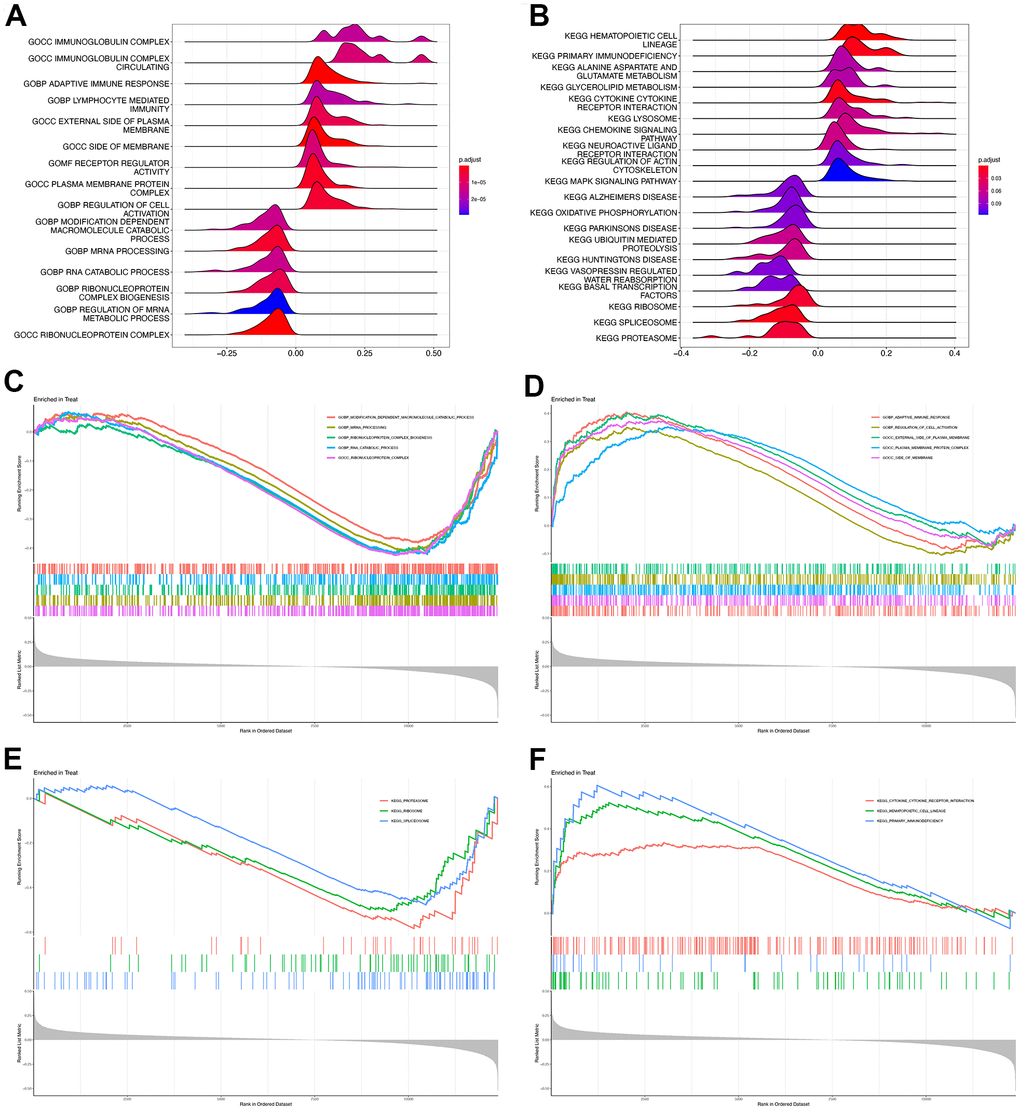 Since ROCK1 had reduced expression and brilliant diagnostic ability in PMOP, we additionally divide the training dataset into two categories (high-ROCK1 group, and low-ROCK1 group) by the median values of the gene expression among the population to further identify the possible role of ROCK1 in PMOP. We first set GSEA for all the gene expression data of 30 healthy controls and 30 PMOP patients. GO enrichment analysis identified “immunoglobulin complex”, “immunoglobulin complex circulating”, “adaptive immune response”, and “lymphocyte-mediated immunity” as the top terms related to PMOP (Figure 9A). For KEGG analysis, the top enriched pathways were “hematopoietic cell lineage”, “primary immunodeficiency”, “alanine aspartate and glutamate metabolism”, “glycolipid metabolism”, and “cytokine receptor interaction” (Figure 9B). The genes of samples in the high-ROCK1 group enriched in “modification dependent macromolecule catabolic process”, “mRNA processing”, “ribonucleoprotein complex biogenesis”, “RNA catabolic process”, and “ribonucleoprotein complex” (Figure 9C). “proteasome”, “ribosome”, and “spliceosome” were the top three results analyzed by KEGG (Figure 9E). The genes in the low-ROCK1 group may have a positive association with PMOP, and the enriched biological terms were “adaptive immune response”, “regulation of cell activation”, “external side of plasma membrane”, “plasma membrane protein complex”, and “side of membrane” (Figure 9D). KEGG functional enrichment analysis indicated that “cytokine receptor interaction”, “hematopoietic cell lineage”, and “primary immunodeficiency” were greatly correlated with samples of the low-ROCK1 group (Figure 9F).