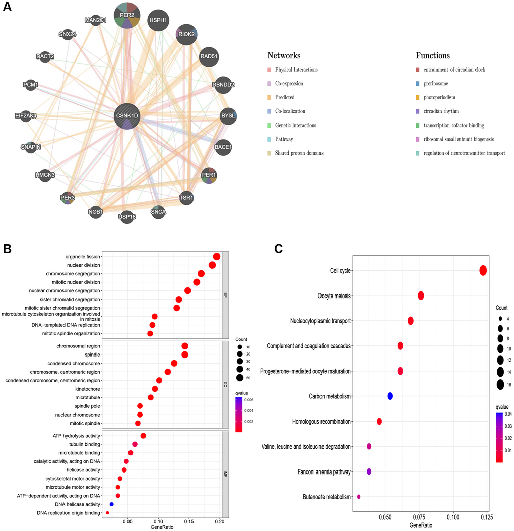 To predict genes with similar functions to CSNK1D, we used the GeneMANIA database. We also performed gene ontology (GO) and Kyoto Encyclopedia of Genes and Genomes (KEGG) analysis on potential molecules with a role in CSNK1D using the “clusterProfiler” R package.