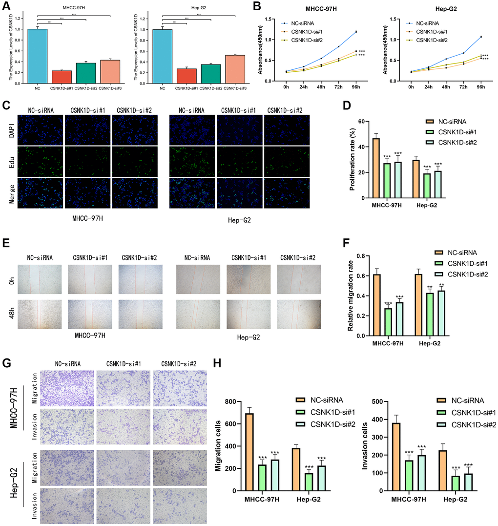 Based on previous research, it was discovered that overexpression of CSNK1D is linked to poor survival in hepatocellular carcinoma (HCC) patients. To delve deeper into the role of CSNK1D in the development of HCC, three siRNA sequences were utilized to knockdown CSNK1D in MHCC-97H and Hep-G2 cell lines. The transfection efficiency was confirmed by qRT-PCR analysis, which demonstrated successful downregulation of CSNK1D expression by all three siRNA sequences (Figure 11A). The control group was named Si-RNA, while the experimental groups were named CSNK1D-Si#1 and CSNK1D-Si#2. Cell viability was measured using a CCK-8 assay, revealing a significant reduction in cell viability in both cell lines upon knockdown of CSNK1D (Figure 11B). These results were validated through an EDU experiment, which demonstrated that downregulation of CSNK1D expression significantly inhibited the proliferation of MHCC-97H and Hep-G2 cells (Figure 11C, 11D). To evaluate the migration ability of Si-RNA and CSNK1D-Si#1 and CSNK1D-Si#2 groups in HCC cell lines, a wound healing assay was performed, which demonstrated that downregulation of CSNK1D significantly inhibited cell migration (Figure 11E, 11F). Transwell assay further confirmed these results, indicating that downregulation of CSNK1D significantly impaired the migration and invasion of MHCC-97H and Hep-G2 cells (Figure 11G, 11H). These findings suggest that CSNK1D positively regulates the proliferation and invasion of HCC cells.