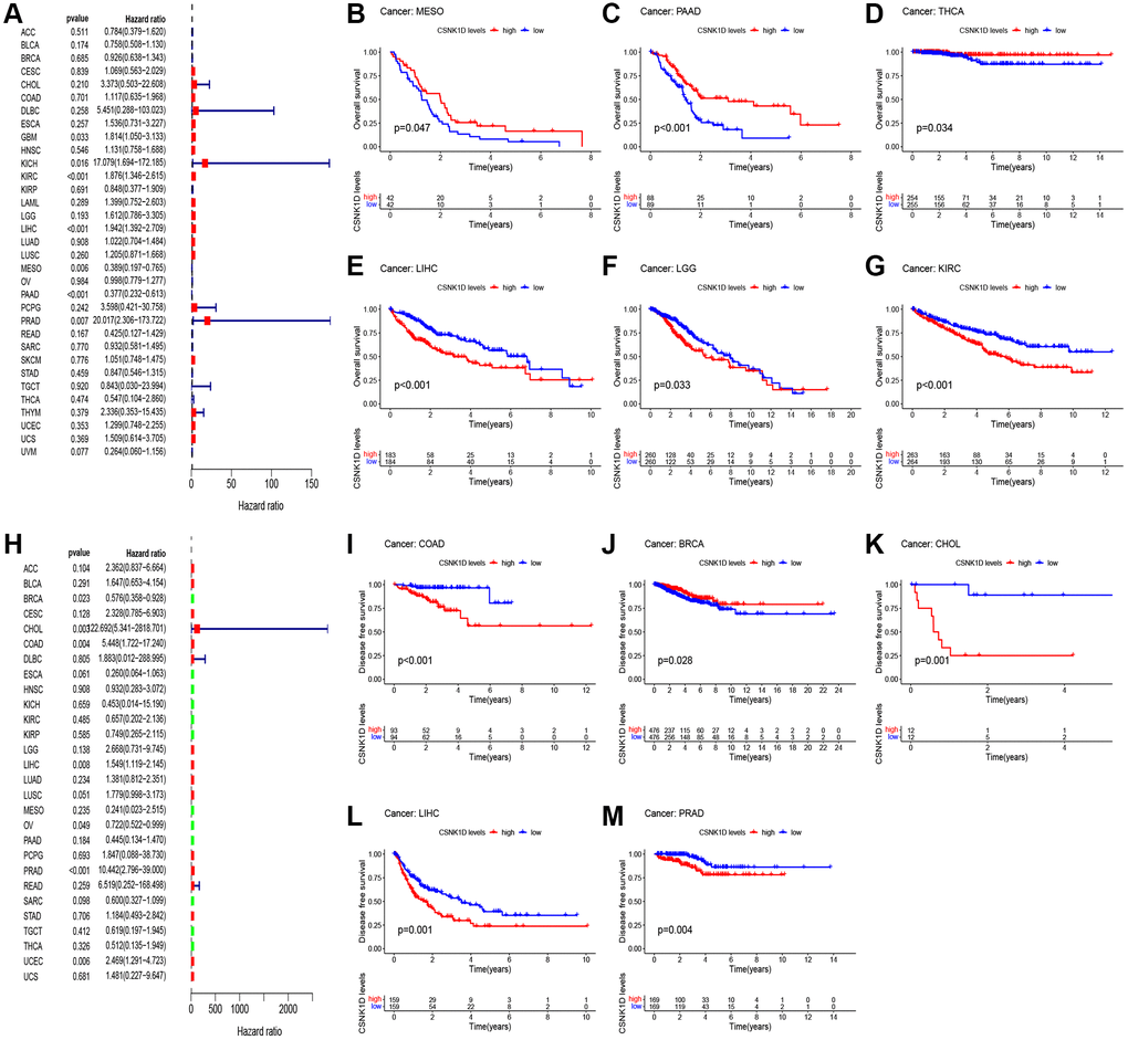 In this section, we aimed to investigate the impact of CSNK1D expression on the prognosis of cancer patients using TCGA RNA-seq and clinical data. We employed univariate Cox regression analysis to explore the association between CSNK1D expression and overall survival (OS) in 33 types of cancer. Our findings showed that CSNK1D was a poor prognostic factor in GBM, KICK, KIRC, LIHC, and PRAD, while it acted as a protective factor in MESO and PAAD (Figure 2A). Similarly, Kaplan-Meier survival analysis indicated that high CSNK1D expression was linked to poor OS in KIRC, LGG, and LIHC, and to favorable OS in MESO, PAAD, and THCA (Figure 2B–2G). Moreover, we performed univariate Cox regression analysis to investigate the correlation between CSNK1D expression and disease-free survival (DFS), disease-specific survival (DSS), and progression-free survival (PFS) in the 33 types of cancer (Figure 2H, Supplementary Figure 1A, 1J). Subsequently, we carried out corresponding Kaplan-Meier survival analysis to validate the results. Our analysis showed that high CSNK1D expression was associated with worse DFS in COAD, CHOL, LIHC, and PRAD, while it had a positive effect in BRCA (Figure 2I–2M). Furthermore, Kaplan-Meier survival analysis of disease-specific survival (DSS) demonstrated that high CSNK1D expression was associated with worse prognosis in LIHC, PRAD, LUSC, LGG, and KIRC, while it had a beneficial effect in MESO, PAAD, and THCA (Supplementary Figure 1B–1I). Finally, Kaplan-Meier survival analysis of progression-free survival (PFS) revealed that high CSNK1D expression was linked to worse prognosis in LIHC, COAD, PRAD, and STAD, while it had a positive effect in PAAD (Supplementary Figure 1K–1O). Overall, our results suggest that CSNK1D expression plays a critical role in cancer prognosis, and its effects may vary depending on the cancer type.