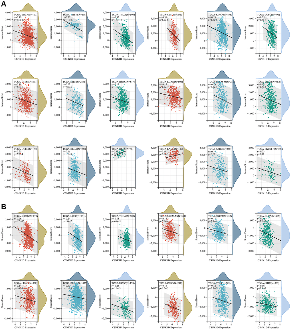 The tumor microenvironment consists of various components, including immune cells, a mesenchymal environment, and a range of molecular factors both inside and outside the tumor. These factors play a crucial role in the initiation, progression, metastasis, and response to therapy of the tumor [21]. Firstly, our objective was to investigate the immune characteristics of CSNK1D in the tumor microenvironment (TME) across various cancers. To achieve this, we employed the ESTIMATE algorithm available on the SangerBox website. It enabled us to evaluate the correlation between CSNK1D expression and three scores (immune, stromal, and estimate) across 33 cancer types. Our findings revealed a negative correlation between CSNK1D expression and immune scores in several cancers, including BRCA, THYM, THCA, CESC, KIPAN, LUSC, STES, KIRP, HNSC, LUAD, SKCM-M, SKCM-P, SKCM, UCEC, BLCA, and SARC, whereas a positive correlation was observed in DLBC and LAML (Figure 4A; P < 0.05). Additionally, the stromal scores were negatively correlated with CSNK1D expression in all cancers (Figure 4B; P < 0.05). Furthermore, our analysis of the estimate score demonstrated a negative correlation with CSNK1D expression in nearly all cancer types, except for DLBC and LAML (Supplementary Figure 3; P < 0.05). These results highlight the potential importance of CSNK1D in shaping the immune characteristics of the TME in various cancers.