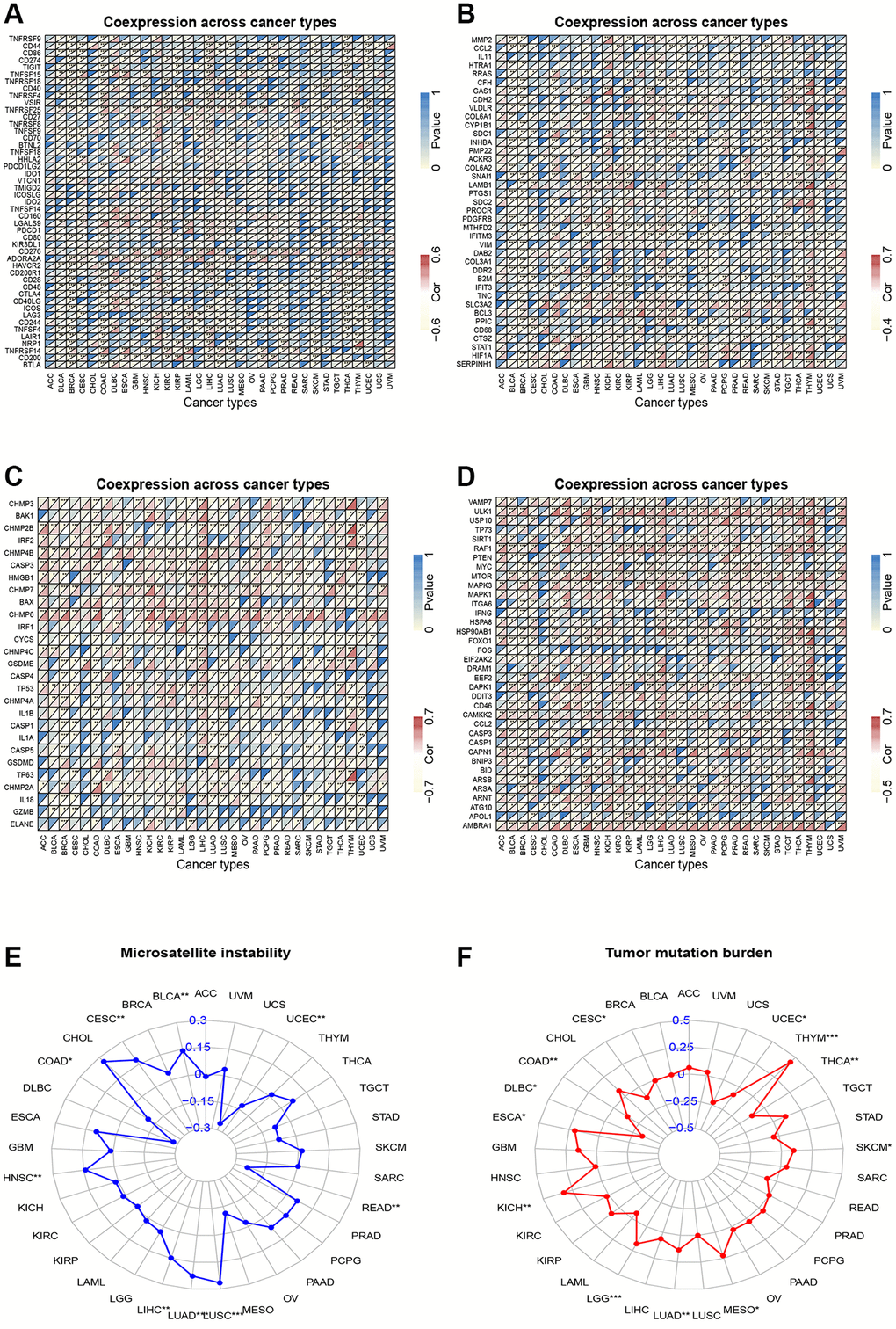 To examine the interplay between CSNK1D expression and the tumor microenvironment across various cancers, we leveraged the ESTIMATE function within the SangerBox tool (http://vip.sangerbox.com/home.html). This tool facilitated the assessment of stromal score, immune score, and ESTIMATE score. In order to delve deeper into the correlation between CSNK1D expression and immune cell infiltration, we employed seven computational tools, including EPIC, TIMER, IPS, QUANTIAEQ, xCell, MCPcounter, and CIBERSORT [20]. Furthermore, we investigated the relationship between CSNK1D expression and immune checkpoint, EMT-related, apoptosis-related, and autophagy-related molecules in 33 tumor types using the “limma,” “reshape2,” and “RColorBrewer” packages. We utilized TCGA data and the ‘fmsb’ R package to gain insights into the relationship between CSNK1D expression, tumor mutation burden (TMB), and microsatellite instability (MSI). Finally, we probed the mutation status of CSNK1D across multiple cancers by accessing the TIMER and cBioPortal databases.