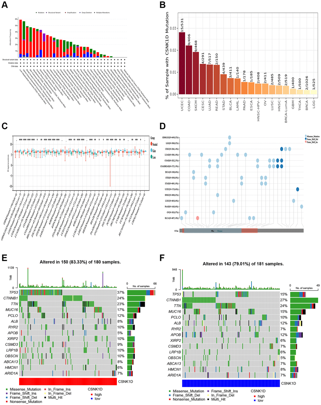 Genetic alterations, which can include mutations, deletions, or amplifications of oncogenes or tumor suppressor genes, have the potential to cause phenotypic changes that may trigger tumorigenesis and promote cancer progression. In this study, we analyzed the genetic changes in the CSNK1D gene using the TCGA cancer dataset through the cBioPortal tool, which included mutations, structural variations, amplifications, and deep deletions. Our findings revealed that liver hepatocellular carcinoma and uterine corpus endometrial carcinoma had the highest mutation rates of CSNK1D (>5%) (Figure 7A). We further examined the mutation rate of CSNK1D in cancer using the TIMER database, which showed that the mutation rate of CSNK1D was highest in UCSC (15/531) and COAD (9/406) (Figure 7B). To further explore the expression relationship between CSNK1D and copy number variations (CNVs) in different types of tumors, we utilized the SangerBox tool based on the TCGA database. We observed significant differences in most cancers, such as GBMLGG, LGG, CESC, LUAD, BRCA, STES, SARC, HNSC, LUSC, LIHC, OV, ACC, etc. (Figure 7C). Single nucleotide variations (SNVs) of the CSNK1D gene among tumors were also analyzed and presented in Figure 7D. Additionally, we analyzed the correlation between CSNK1D expression and specific genomic features in the TCGA-LIHC dataset. Our results indicated that the CSNK1D high group (n = 150) had higher somatic mutation frequencies of TP53 (37%), CTNNB1 (24%), and TTN (23%) genes, while the CSNK1D low group (n = 142) had higher somatic mutation frequencies of TP53 (15%), CTNNB1 (27%), and TTN (24%) genes (Figure 7E, 7F).