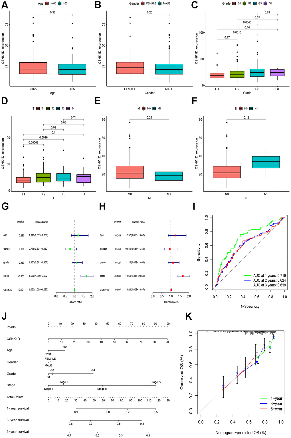 The previous research findings have suggested that CSNK1D may have a significant role in the development of hepatocellular carcinoma. To further understand this relationship, we examined the expression of CSNK1D in hepatocellular carcinoma patients at different clinical stages. Firstly, we obtained the expression data from TCGA-LIHC database, which consisted of 50 normal samples and 374 tumor samples. Specific clinical information is provided in Supplementary Table 1. Our results indicate that CSNK1D expression levels were higher in patients with advanced T staging and histological grading (Figure 8C, 8D), whereas no significant differences were observed with respect to age, gender, N, and M staging (Figure 8A, 8B, 8E, 8F). These findings suggest that CSNK1D expression may be associated with the malignant progression of hepatocellular carcinoma. To evaluate the prognostic effect of CSNK1D, we conducted univariate and multivariate COX regression analyses, which revealed that CSNK1D is an independent prognostic factor for hepatocellular carcinoma (Figure 8G, 8H). Furthermore, the prognostic evaluation effect of CSNK1D was assessed using the ROC liver cancer overall survival rate. Our results demonstrate that CSNK1D has a good prognostic evaluation effect in hepatocellular carcinoma, with an AUC of 0.719, 0.624, and 0.618 for 1-year, 3-year, and 5-year survival rates, respectively (Figure 8I). To evaluate the clinical application of CSNK1D, we constructed a nomogram based on the expression of CSNK1D and pathological staging (Figure 8J). The accuracy of the prognostic evaluation model was assessed using calibration curves, and the results indicated that the nomogram was very accurate, almost as good as the ideal model (Figure 8K).