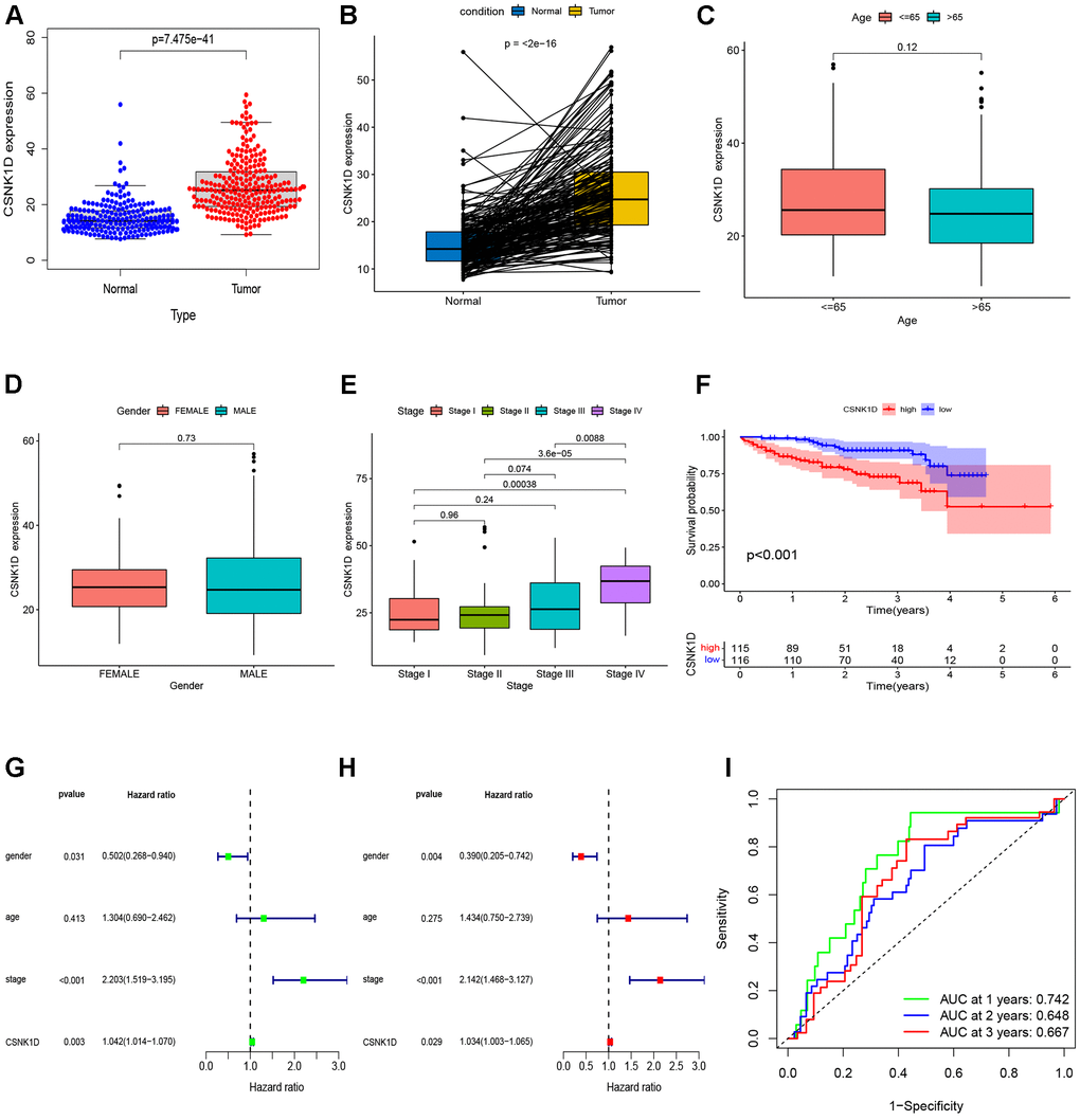 To provide further confirm the prognostic value of CSNK1D in hepatocellular carcinoma (HCC), we analyzed the expression of CSNK1D in both cancerous and adjacent tissues from the ICGC-LIRI-JP cohort. To begin, we collected the expression data and clinical information for ICGC-LIRI-JP from the ICGC database. The dataset included 202 normal samples and 240 tumor samples, ensuring a robust sample size for analysis. Detailed clinical information can be found in Supplementary Table 2. Our analysis, including non-paired (Figure 9A) and paired (Figure 9B) comparisons, indicated higher expression of CSNK1D in liver cancer tumor tissues. We further evaluated the relationship between CSNK1D expression in HCC and clinical staging, and found that the expression of CSNK1D increased with increasing stage, but was not related to age and gender (Figure 9C–9E). Additionally, Kaplan-Meier curve analysis showed that patients with high CSNK1D expression had poorer survival outcomes (Figure 9F). Furthermore, both univariate and multivariate COX analysis indicated that CSNK1D was an independent prognostic risk factor for HCC (Figure 9G, 9H). To assess the prognostic effect of CSNK1D, we performed ROC survival rate analysis for HCC and found that CSNK1D exhibited a good prognostic evaluation effect, with AUCs of 0.742, 0.648, and 0.667 for 1 year, 3 years, and 5 years, respectively (Figure 9I).