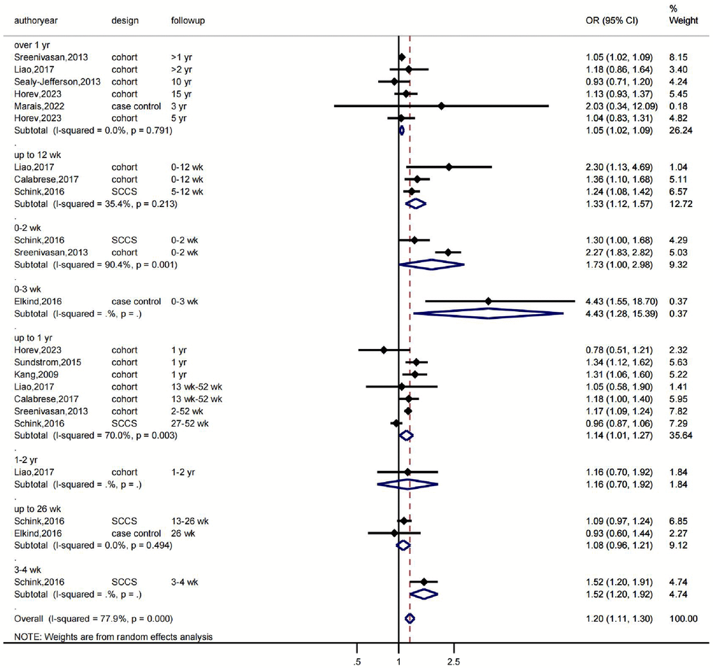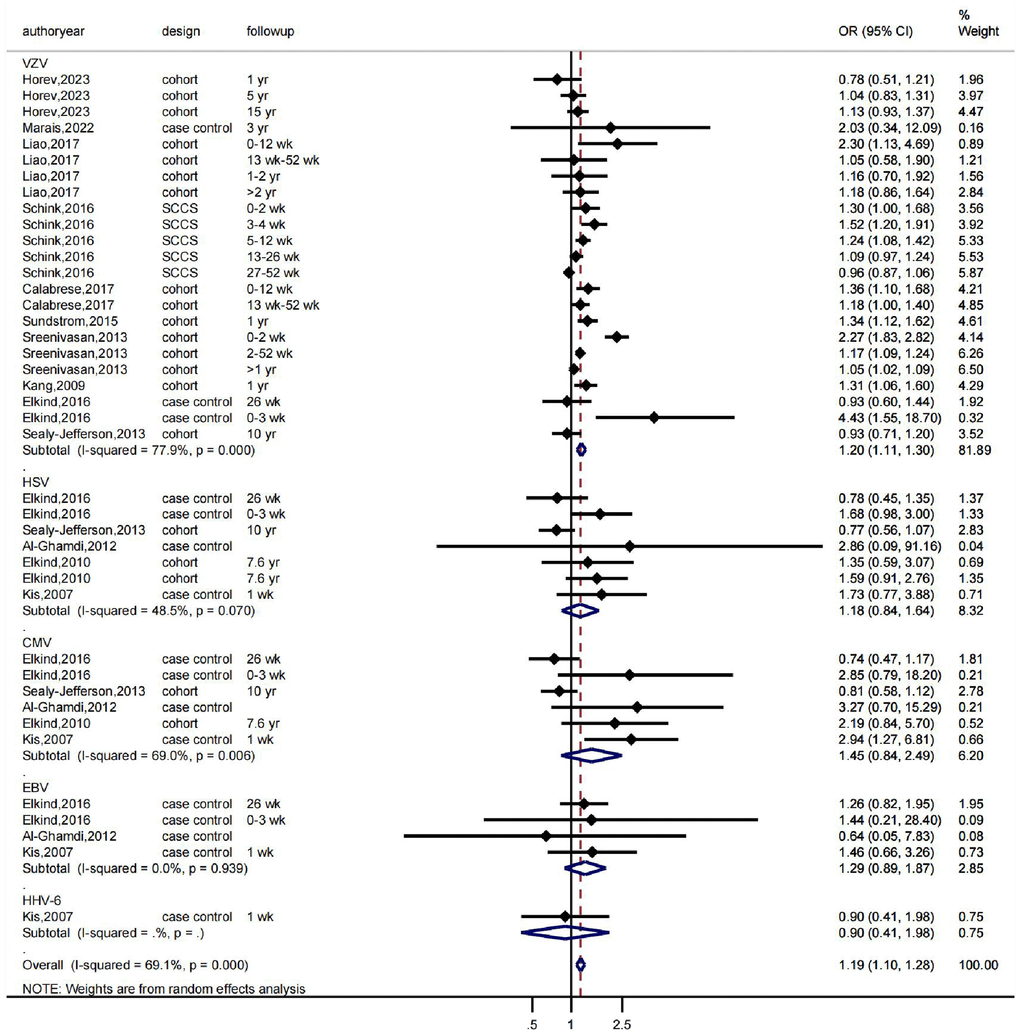 First, we conducted a meta-analysis evaluating the association between various herpesvirus infections and stroke using a random-effects model. The findings revealed that whereas HSV infection was linked to a higher incidence of stroke (OR: 1.18, 95% CI 0.84–1.64, I2 = 48.5%), VZV infection was not (OR: 1.20, 95% CI 1.11–1.30, I2 = 77.9%). While EBV infection was linked to a higher incidence of stroke (OR: 1.29, 95% CI 0.89–1.87, I2 = 0.0%), CMV infection was not (OR: 1.45, 95% CI 0.84–2.49, I2 = 69%) (Figure 1). As shown in Figure 1, there was significant heterogeneity in the VZV group model analysis. Therefore, we further performed a subgroup analysis based on follow-up time, which showed that VZV infection was associated with stroke risk in all follow-up periods, including over 1 year, up to 12 weeks, and up to 26 weeks, and that VZV infection was associated with an increased risk of stroke (Figure 2).