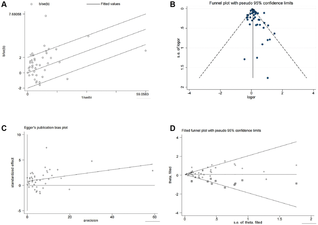 We then conducted further analyses to assess heterogeneity, publication bias, and sensitivity. The Galbraith plot indicated that several studies were outside the confidence interval, suggesting that these studies had larger heterogeneity and may have had a greater impact on the combined effect size (Figure 3A). The funnel plot showed that several studies were not scattered within the funnel (Figure 3B). The Egger’s test indicated a significant asymmetry in the funnel plot with statistical significance (P = 0.019) (Figure 3C), indicating the presence of publication bias in the analysis results. Further sensitivity analysis using the trim and fill method showed that the effect sizes (before: fixed: 0.096; random: 0.171; after: fixed: 0.083; random: 0.106) and P values (both less than 0.05) changed little, indicating that the meta-analysis results were stable and reliable (Figure 3D). Finally, we examined the influence of individual studies on the results, and the combined effect sizes of each study were within the confidence interval range, indicating that there was little difference among the studies (Supplementary Figure 1).