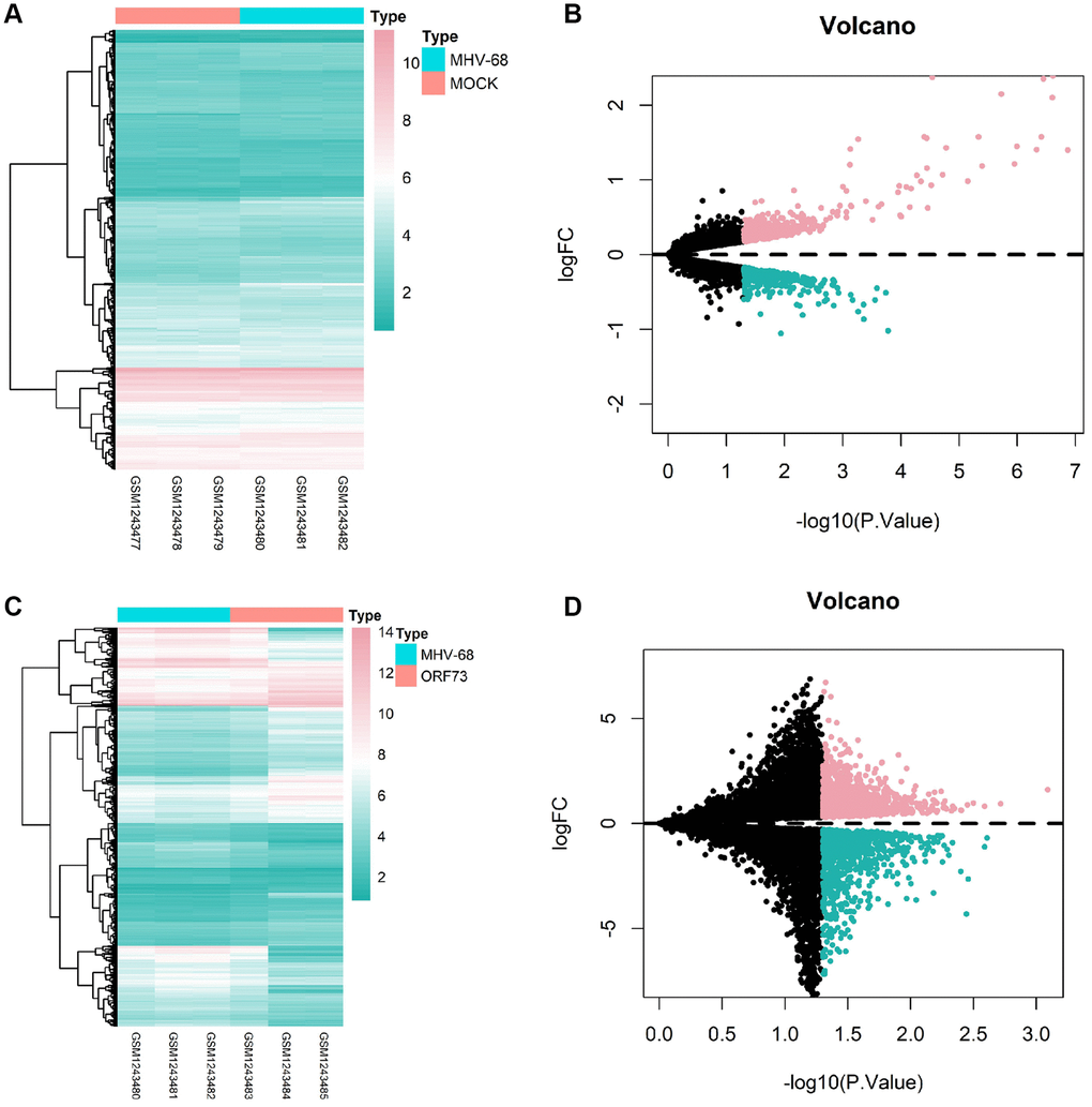 To investigate the potential molecular mechanisms underlying herpesvirus latent infection-induced cerebral infarction, we first retrieved the dataset GSE51365 from the GEO database, which contains transcriptome changes induced by latent herpesvirus infection in different organs. We selected brain tissue samples from the control (MOCK) group, wild-type (MHV-68) group, and mutant-type (ORF73) group infected with gamma herpesvirus for differential analysis. We identified 900 differentially expressed genes (449 upregulated and 451 downregulated) in the MHV-68 group (Figure 4A, 4B) and 2104 differentially expressed genes (1142 upregulated and 962 downregulated) in the ORF73 group (Figure 4C, 4D).