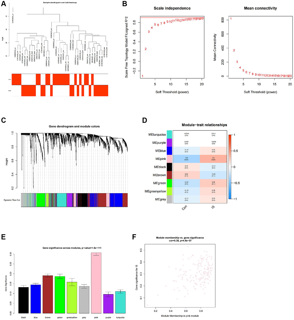 We further performed a WGCNA co-expression analysis on the GEO stroke-related expression profile dataset. After the hierarchical clustering of the samples (Figure 5A), a soft-thresholding power of β = 12 (scale-free R2 = 0.9) was selected to construct a scale-free network (Figure 5B). Nine gene co-expression modules were identified in the GSE22255 dataset (Figure 5C), among which only the pink module was significantly associated with stroke occurrence with a correlation level of 0.4 (P = 0.01) (Figure 5D). The module gene importance was also calculated and revealed that the pink module genes had the highest gene significance score, and their gene importance was significantly positively correlated (Figure 5E, 5F). Therefore, we identified 165 genes in the pink module as stroke-associated hub genes.