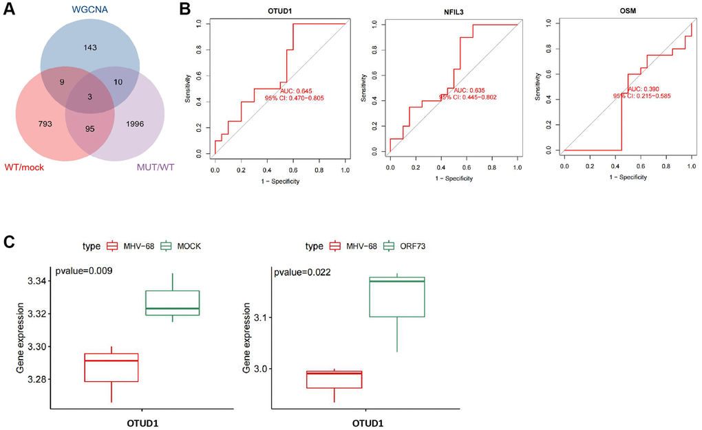 To further identify key genes in the mechanism of herpesvirus latent infection-induced stroke, we took the intersection of the hub genes identified by WGCNA and the differentially expressed genes in wild-type and mutant herpesvirus-infected brain tissues, resulting in three overlapping genes: OTUD1, NFIL3, and OSM (Figure 6A).