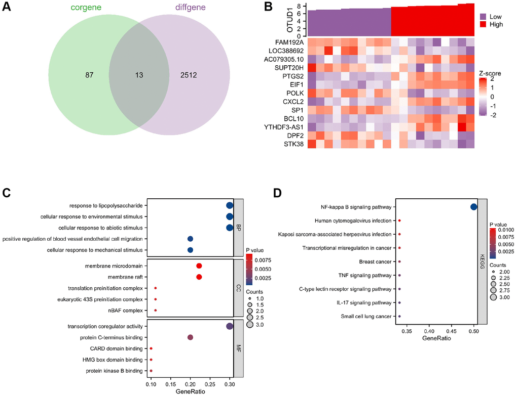 Pearson correlation analysis was used to screen for genes related to OTUD1 in dataset GSE22255, and the intersection of differentially expressed genes obtained from dataset GSE22255 and the genes related to OTUD1 were visualized using a co-expression heatmap. Further, GO (Gene Ontology) and KEGG (Kyoto Encyclopedia of Genes and Genomes) enrichment analysis was performed using R packages such as “clusterProfiler,” “org.Hs.eg.db,” “enrichplot,” and “GOplot.” The GO and KEGG enrichment analysis results were visualized using a bubble plot [27].