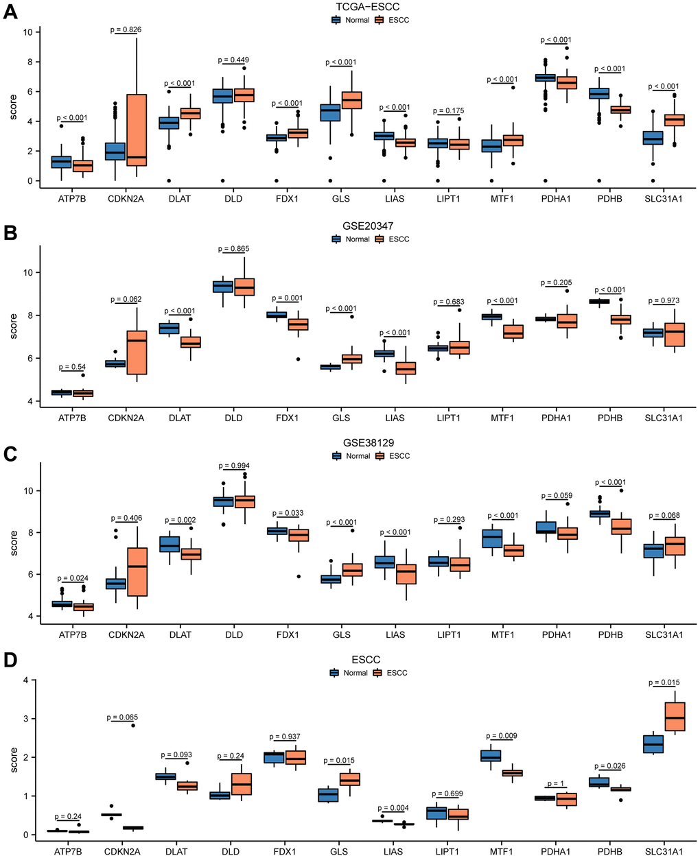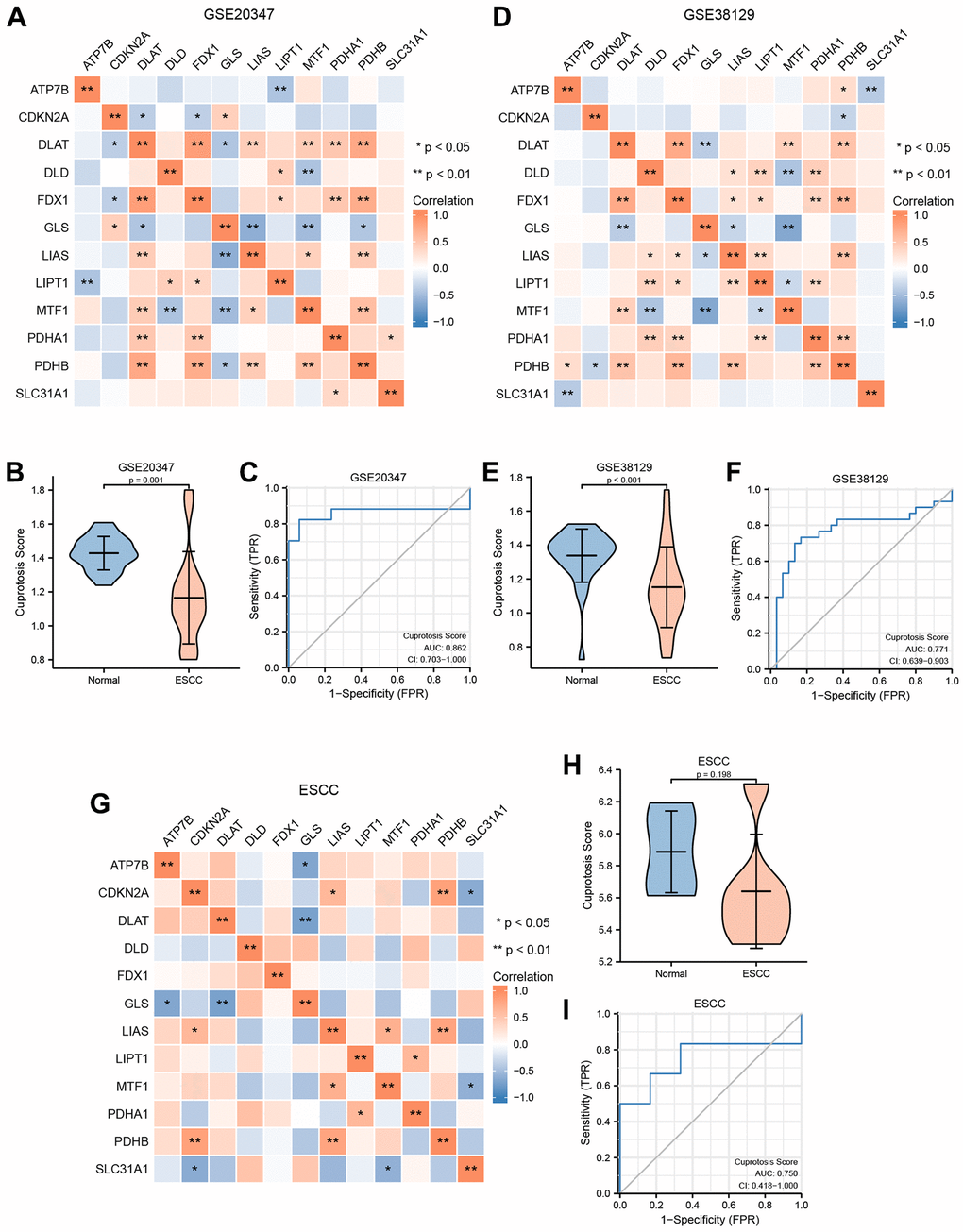 Moreover, based on the expression level of the 12 CRGs from these three verification datasets, we utilized the ssGSEA algorithm to evaluate the CPs of each sample. Then, we used the Wilcoxon rank sum test to quantify the difference of CPs between the normal group and the ESCC group in the three verification datasets. The correlation analysis revealed a statistically significant difference of CPs between the normal group and the ESCC group in GSE20347 and GSE38129 (Figure 5B, 5E). Conversely, we found that the difference of CPs was not statistically significant between different groups in the ESCC dataset (Figure 5H).