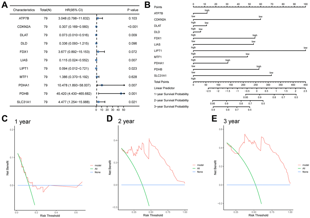 Afterwards, a Decision Curve Analysis (DCA) was performed to evaluate the clinical value of the LASSO-Cox regression prognosis model for 1-year (Figure 10C), 2-year (Figure 10D), and 3-year (Figure 10E) time points. In the DCA curve, the x-axis represents the threshold probability, while the y-axis displays the net benefit. The results were determined by observing the x-value range of the model line that is higher than all positive line and all negative line. The larger the range of X-value, the better the clinical judgment utility. The DCA analysis revealed that the risk score model constructed by 11 CRGs (ATP7B, CDKN2A, DLAT, DLD, FDX1, LIAS, LIPT1, MTF1, PDHA1, PDHB, SLC31A1) had the best clinical judgment utility for 3-year followed by 2-year and 1-year.