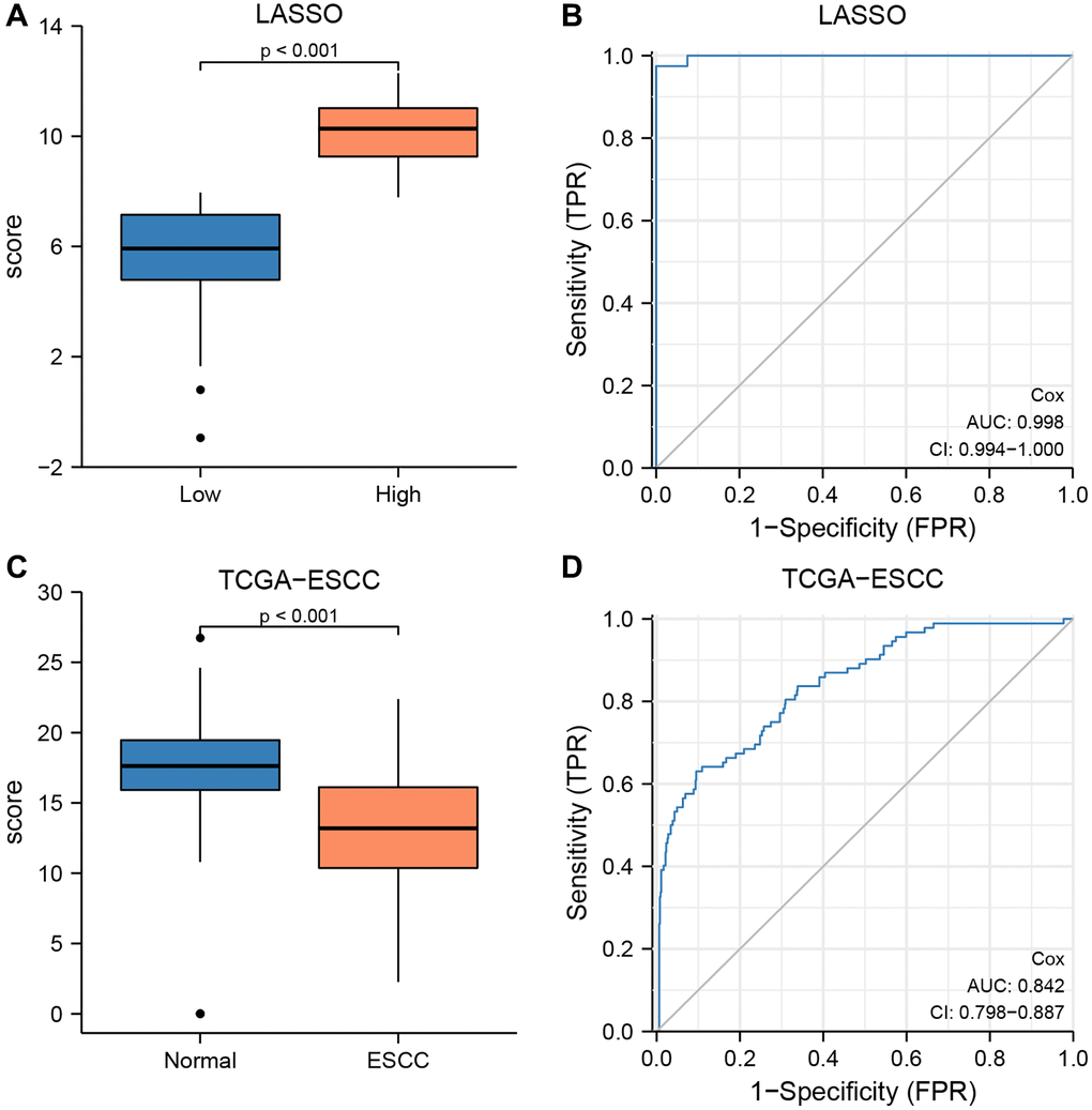 To validate the diagnostic accuracy of the LASSO-Cox regression prognosis model, we utilized Mann-Whitney U tests to calculate the difference in risk scores between the ESCC and normal groups in the TCGA-ESCC cohort (Figure 11C, 11D). Our analysis demonstrated a highly significant difference in risk score between the two groups (P < 0.001, Figure 11C), indicating the model’s effectiveness in distinguishing between the two groups. Additionally, we generated an ROC curve to evaluate the diagnostic capacity of the risk score system, with the resulting analysis shown in Figure 11D. The area under the curve (AUC) for the TCGA-ESCC prognostic model was 0.842.