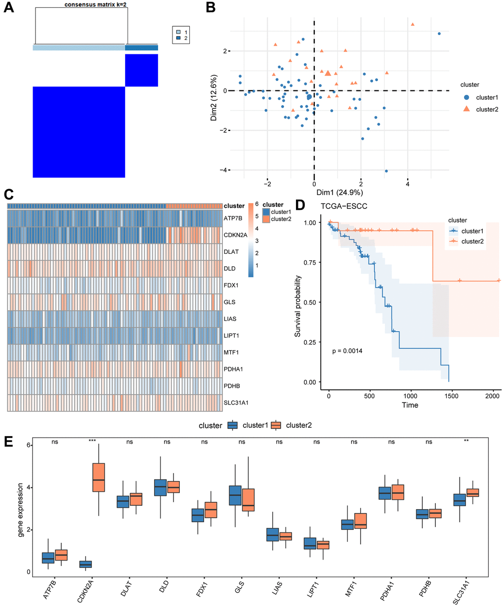 Initially, we investigated the differential expression of CRGs in ESCC patients from the TCGA-ESCC cohort by using the “ConsensusClusterPlus” R package for consensus clustering analysis based on 12 CRGs (ATP7B, CDKN2A, DLAT, DLD, FDX1, GLS, LIAS, LIPT1, MTF1, PDHA1, PDHB, SLC31A1). This led to the separation of tumor samples into 2 clusters (Figure 3A). Cluster 1 consisted of 59 tumor samples, while cluster 2 contained 21 tumor samples. Next, we performed principal component analysis (PCA) on the expression matrix from these 2 ESCC subtypes. The results showed significant differences in the cuproptosis transcription profiles between cluster 1 and cluster 2 (Figure 3B). We then used a heatmap to identify the gene expression pattern of each subtype (Figure 3C), which revealed a few differences in expression level of the 12 CRGs between the two ESCC subtype from the TCGA-ESCC cohort.