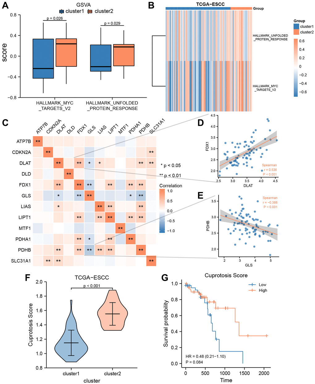 Spearman correlation analysis was used to investigate the expression levels of 12 CRGs (ATP7B, CDKN2A, DLAT, DLD, FDX1, GLS, LIAS, LIPT1, MTF1, PDHA1, PDHB, and SLC31A1) from the TCGA-ESCC cohort, and the results are presented in Figure 4C. As shown in Figure 4C, only the expression level of GLS was negatively correlated with that of other CRGs, while the expression levels of other CRGs were positively correlated. Additionally, we displayed the correlation scatter plots for the two pairs of genes with the highest and lowest correlation (Figure 4D, 4E). Among the 12 CRGs in the TCGA-ESCC cohort, DLAT and FDX were significantly positively correlated (r = 0.536, P < 0.001, Figure 4D), while GLA and PDHB were significantly negatively correlated (r = −0.388, P < 0.001, Figure 4E).