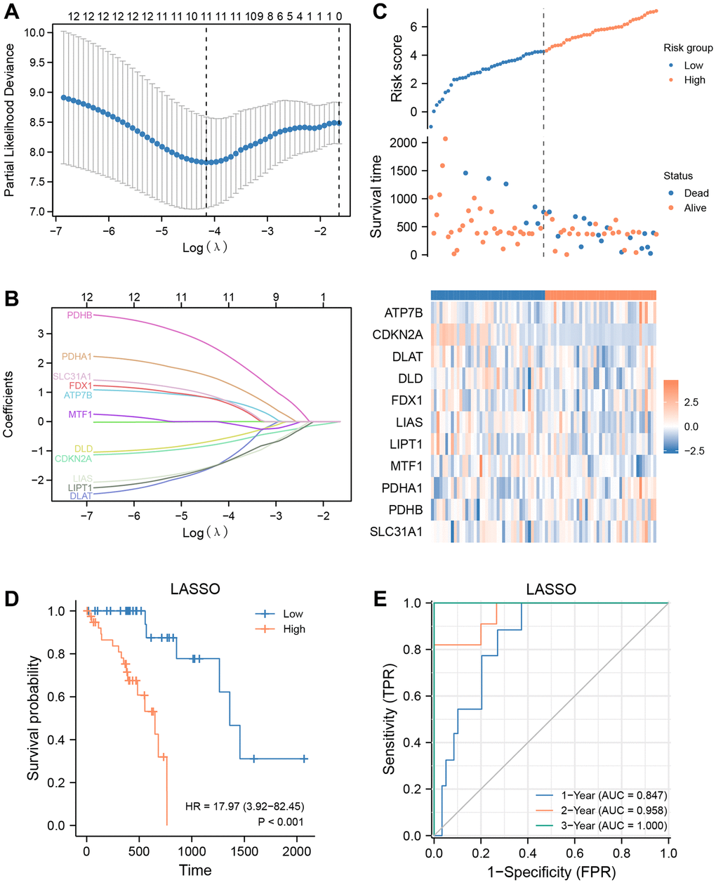 RiskScores = ATP7B × 1.114 + CDKN2A × −1.180 + DLAT × −2.618 + DLD × −1.091 + FDX1 × 1.302 + LIAS × −2.163 + LTPT1 × −2.366 + MTF1 × 0.326 + PDHA2 × 2.349 + PDHB × 3.816 + SLC31A1 × 1.499.