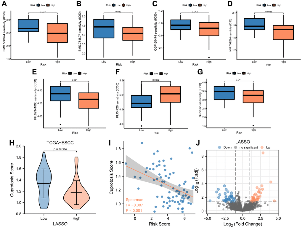 The TCGA-ESCC cohort was stratified into low- and high-risk groups using the median risk score. To investigate the differences in drug sensitivity between these groups, we compared the IC50 values of multiple antitumor drugs in both low- and high-risk groups (Figure 7A–7G). Our drug sensitivity analysis revealed significant differences between the low- and high-risk groups in seven drugs, including BMS.536924 (Figure 7A), BMS.754807 (Figure 7B), CGP.60474 (Figure 7C), NVP.TAE684 (Figure 7D), PF.02341066 (Figure 7E), PLX4720 (Figure 7F), and Sunitinib (Figure 7G). Notably, Sunitinib (Figure 7G, P < 0.05) was more effective in patients in the low-risk group, whereas the other six drugs were more effective in patients in the high-risk group.