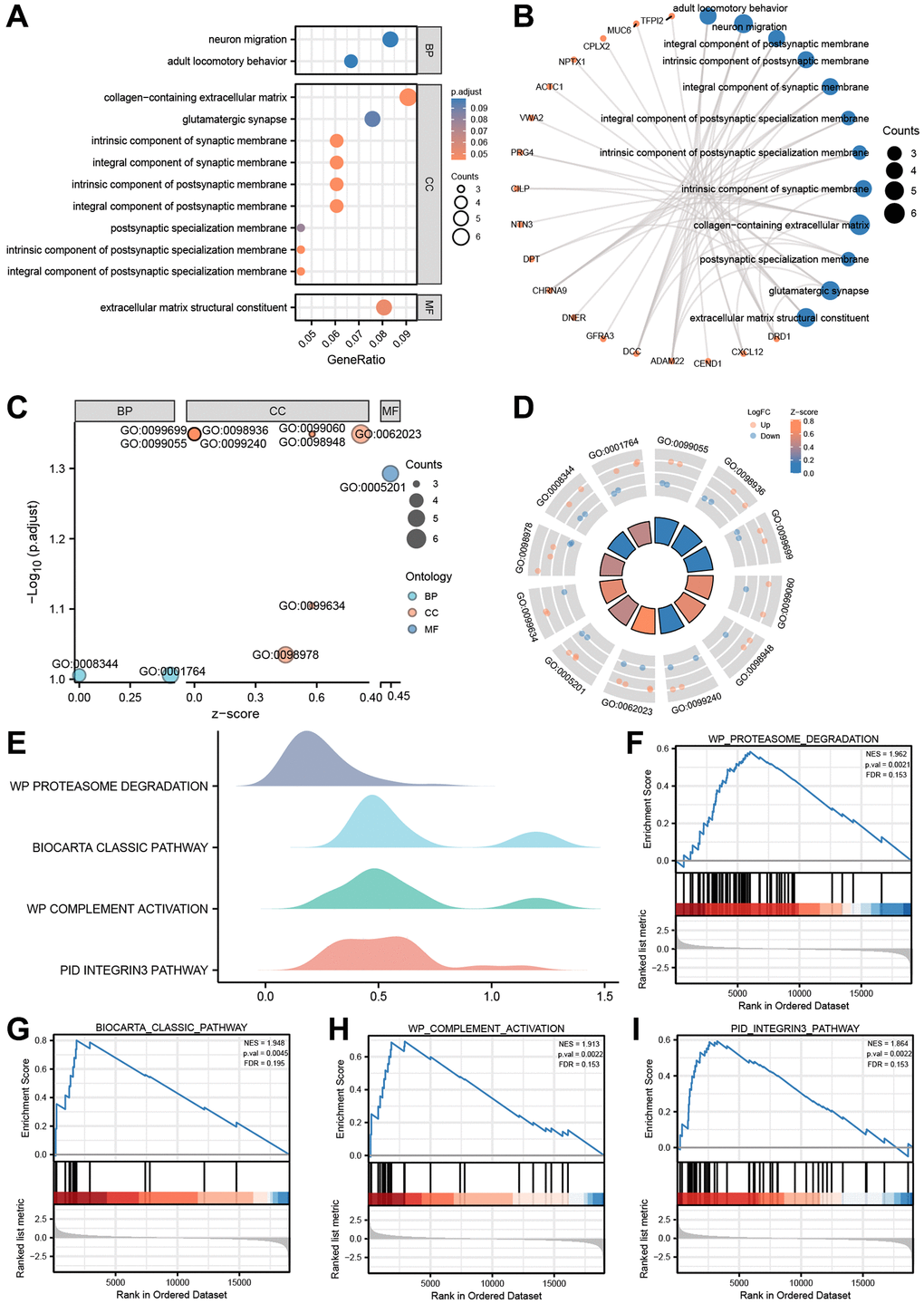 After being converted into gene IDs, the 71 differentially expressed genes (DEGs) were analyzed using Gene Ontology (GO) (Supplementary Table 4). The GO annotations of the DEGs consisted of three parts: CC (cellular component), BP (biological process), and MF (molecular function), which were used to analyze the functional enrichment of the DEGs. The results were visualized in a bubble plot (Figure 8A). The main biological processes involved adult locomotory behavior and neuron migration, while the most abundant cellular component terms were the integral component of postsynaptic membrane, intrinsic component of postsynaptic membrane, integral component of synaptic membrane, and integral component of postsynaptic specialization membrane. The most abundant molecular function terms were extracellular matrix structural constituent. Additionally, we also visualized the results of GO functional enrichment analysis with a circos plot (Figure 8B).