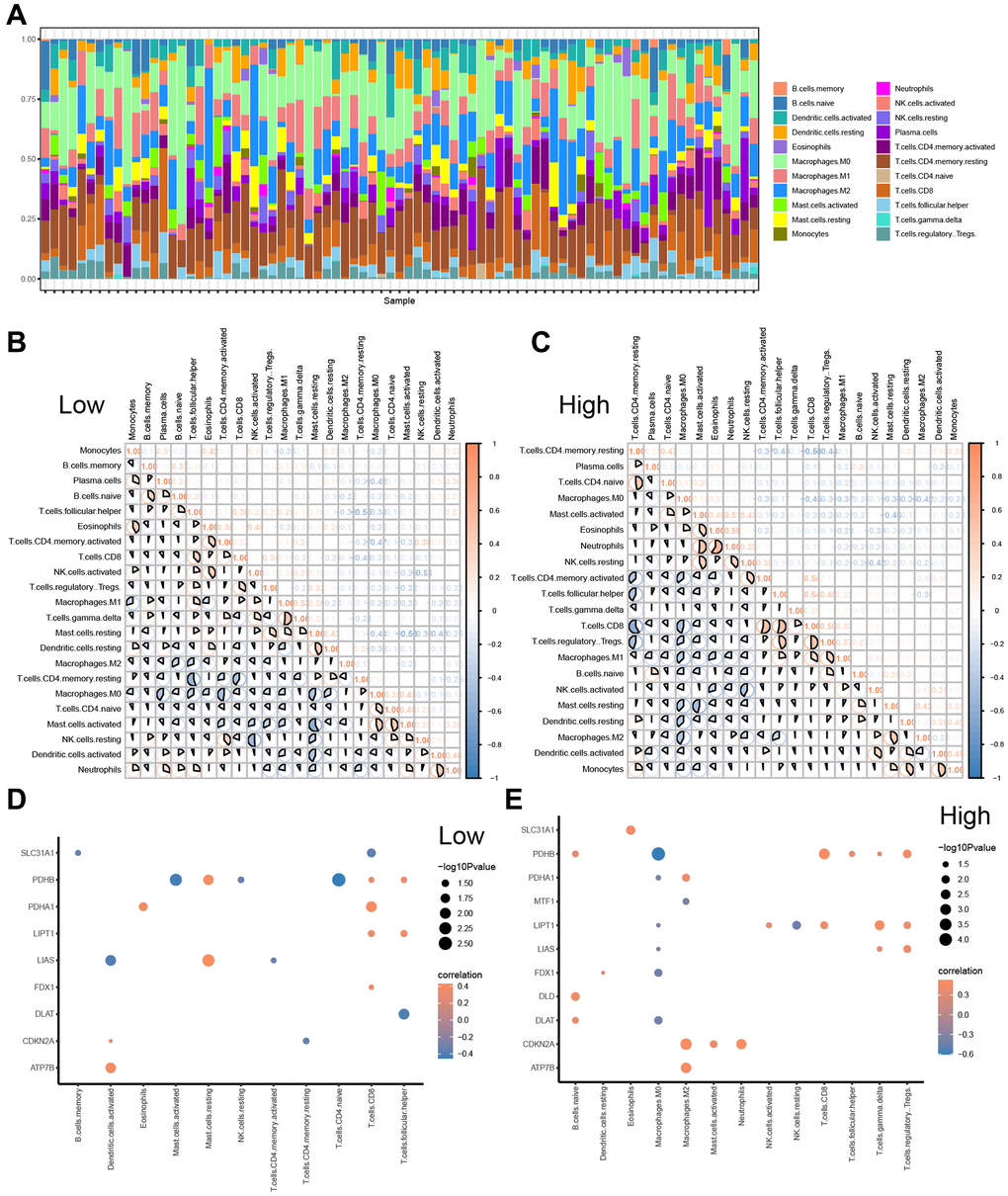 Additionally, we investigated the correlation between the expression of 11 CRGs (ATP7B, CDKN2A, DLAT, DLD, FDX1, LIAS, LIPT, MTF1, PDHA1, PDHB, and SLC31A1) and the infiltration abundance of 22 types of immune cells in the low-risk (Figure 9D) and high-risk groups (Figure 9E), respectively. The screening criterion for correlation analysis was a P value < 0.05. Our results showed that CRG expression levels were statistically positively correlated with the infiltration abundance of Mast cells resting in the low-risk group, while the infiltration abundances of Mast cells activated and T cells CD4 naive were positively correlated with PDHB expression levels in the low-risk group (Figure 9D). Conversely, most immune cell infiltration abundances were positively correlated with the expression levels of 12 CRGs in the high-risk group (Figure 9E).