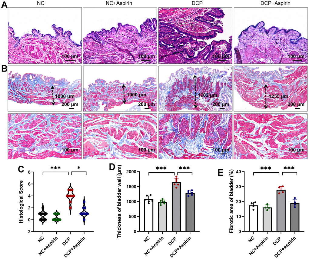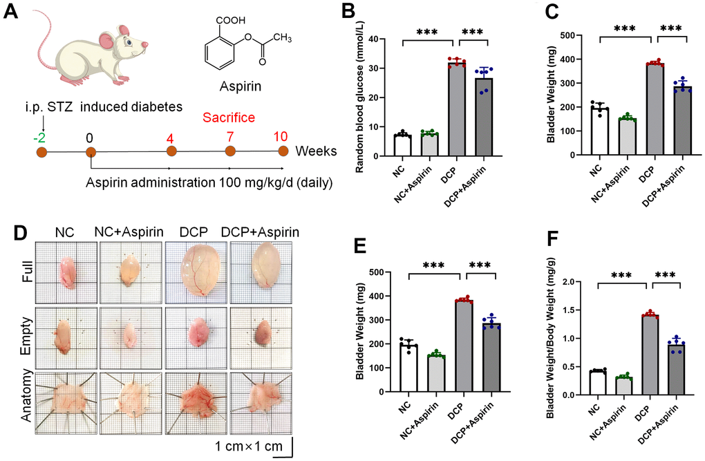 Taken together, these findings strengthen the case for consideration of long-term aspirin use in DCP treatment. There are still some limitations in this study. To better understand the relevance of bladder hypertrophy in many models of experimental diabetes, it is still necessary to further investigate separately in type 1 and type 2 diabetes [34]. The damage is a gradually changing process, thus the experiment still needs to dynamically observe at longer and more time points. There is a lack of consensus about the balance of risks and benefits associated with long-term aspirin use, particularly on high doses. Considering medication safety, it is essential to guide precision treatments that maximize benefits and minimize risks. The optimal dose for DCP treatment and the precise mechanism of underlying aspirin’s anti-inflammatory effect require further investigation. Intravesical drug delivery can be considered in future studies to decrease harmful side-effects and drug toxicity, and improve drug bioavailability.
