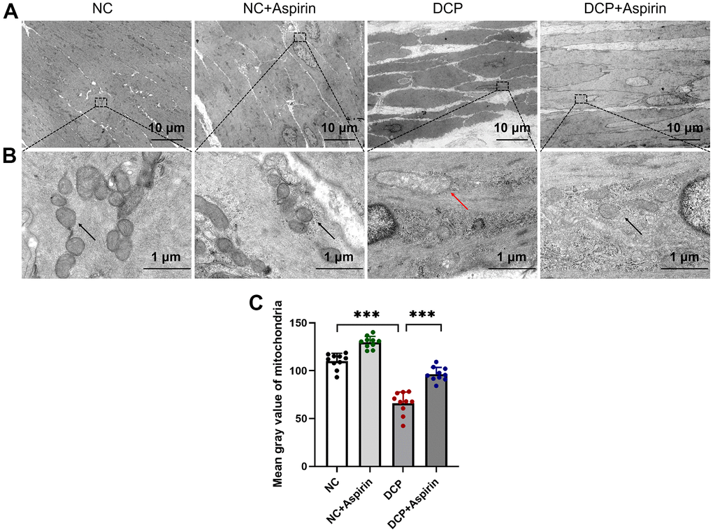 Morphometric analysis under the light microscope revealed a remarkable increase in the areas of the detrusor muscle and urothelium in diabetic rats (Figure 2). To take a closer look, the bladder detrusor smooth muscle cells (DSMCs) and fibroblasts were observed under transmission electron microscopy (TEM). The detrusor histology of the DCP group rats was characterized by the presence of thickened and hypertrophied microfibers, some of which were dissolved and necrotic (Figure 3A). Besides that, as shown in Figure 3B, there was severe mitochondrial damage in the DSMCs of the diabetic rat bladder, manifested as increased mitochondrial volume, decreased number of “ridges”, ruptured or even disappeared, and decreased mitochondrial matrix optical density (Figure 3C). In addition, mitochondrial vacuolar degeneration and endoplasmic reticulum swollen was observed. Aspirin repaired the damaged DSMCs by reducing mitochondrial damage.