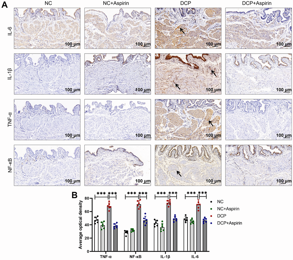 Data were further analyzed with GraphPad Prism 9.0.0 software (San Diego, CA, USA) and were expressed as the mean ± SD. The histological score was assessed using a Kruskal-Wallis test followed by Dunn’s multiple comparisons test. The other data were analyzed with ANOVA followed by the Tukey’ s multiple comparisons test. All images were processed and analyzed using dedicated software (Image Pro 6.0). All microscopic sections were randomly selected and reviewed by two pathologists, who were blinded to the study design. Percentage change of the DCP group from the NC group or percentage change of the DCP+Aspirin group from the DCP group. n=the number of strips or PCR samples and N=the number of rats. P < 0.05 was considered statistically significant.