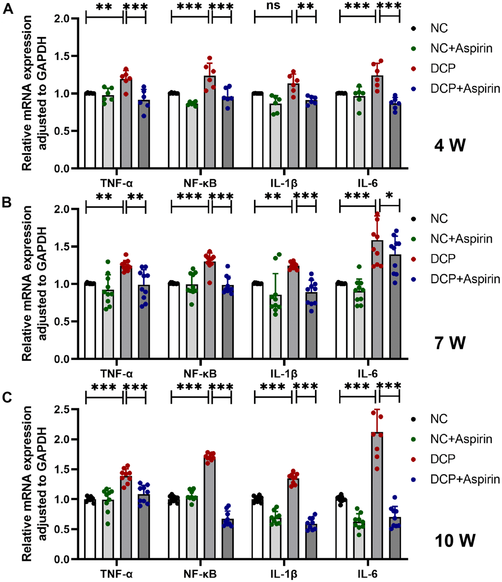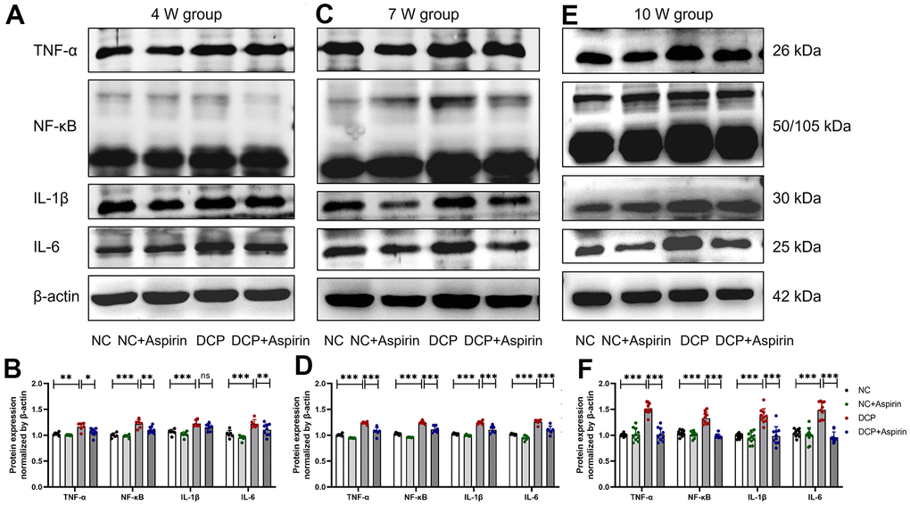 To explore how aspirin treatment prevented bladder injury, we evaluated mRNA and protein expression levels of pro-inflammatory cytokines at different stages of diabetes. As shown in Figure 5A, after 4 weeks of aspirin treatment, the mRNA expression levels of TNF-α, NF-κB, IL-1β, and IL-6 in the DCP group increased by 19.1% (p < 0.01), 23.3% (p < 0.001), 13.2% (p = 0.1087) and 23.6% (p < 0.001) respectively compared with the control group. After 7 weeks, TNF-α, NF-κB, IL-1β and IL-6 in the DCP group were 23.6% (p < 0.01), 29.1% (p < 0.001), 23.5% (p < 0.01) and 57.5% (p < 0.001) higher than those of the control group (Figure 5B). Statistics on 10 weeks increased (p < 0.001) by 39.1%, 70.2%, 34.5% and 111.8%, respectively (Figure 5C). To go along with this, compared with the DCP group, the mRNA expression levels of TNF-α, NF-κB, IL-1β, and IL-6 in the DCP+Aspirin group decreased to 76.7%, 75.3%, 81.9% and 71.6% after 4 weeks of aspirin treatment; 79.5%, 75.7%, 71.6% and 87.9% after 7 weeks of aspirin treatment; 78.0%, 39.7%, 44.1% and 33.3% after 10 weeks of aspirin treatment.
