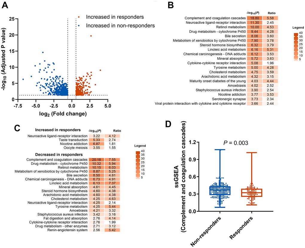 In order to identify potential predictive biomarkers of ICIs, we explored the DEGs between responders and non-responders to ICIs in the mUC cohort. In total, 1,613 DEGs were identified with 1,080 genes upregulated and 533 genes downregulated in responders group (Figure 1A). KEGG enrichment analysis for the 1,613 genes identified 28 significant different pathways (P<0.05) between responders and non-responders of ICIs (Figure 1B and Supplementary Table 3), including complement and coagulation cascades pathway, which was also enriched in the downregulated genes of responders (Figure 1C). To further study the association between CCCP and response to ICIs, ssGSEA algorithm was performed to calculate the CCCP enrichment score, which represents the degree of absolute enrichment of CCCP in each patient. As a result, the CCCP score was significantly lower in responders compared to non-responders (P = 0.003, Figure 1D), suggesting that the majority of CCCP-related genes were downregulated in the responders of ICIs in mUC. Taken together, these results suggested that CCCP might be associated with the immunotherapeutic responsiveness in patients with mUC.
