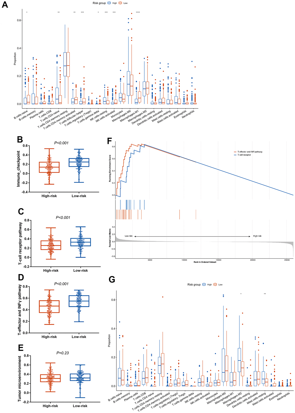To further investigate the association between the CCCP risk score and immune characteristics, we compared the immune cell infiltrates between low-risk and high-risk groups using CIBERSORT algorithm [34]. We found that macrophages M1, activated NK cells, activated CD4+ memory T cells, and T follicular helper cells (Tfh) were significantly higher in low-risk group in mUC cohort, while naive CD4+ T cells and resting NK cells were significantly higher in high-risk group (P<0.01, Figure 3A). In addition, correlation analysis of these tumor infiltrating immune cells and CCCP risk score revealed that the infiltration level of macrophages M1 (P<0.001), activated CD4 + memory T cells (P = 0.006), Tfh (P = 0.02), and activated NK cells (P = 0.04) were negatively correlated to the risk score, while naive CD4+ T cells (P < 0.001) and resting NK cells (P = 0.04) were positively correlated with the risk score (Supplementary Figure 5), suggesting that CCCP risk score was correlated with the immune activity in TME. The correlation analysis between immune cell infiltrations and the individual genes included in the CCCP risk score were illustrated in Supplementary Figure 6. The proportion of macrophages M1 was positively correlated with the expression of C2, C1QB, SERPING1, CFB, and F2R. The proportion of activated CD4+ memory T cells was positively correlated with the expression of C2, C1QB, SERPING1 and CFB. Moreover, the proportion of CD8+ T cell and activated NK cell were positively correlated with C2 and C1QB expression. By contrast, the proportion of pro-tumor immune cells such as naive CD4+ T cells, activated dendritic cells, and resting NK cells were negatively correlated with the expression of several signature genes including C2, F2R, and C1QB. Besides, ssGSEA analysis were used to distinguish the immune characteristics between high- and low-risk groups. As a result, the activity of immune checkpoint, T cell receptor, and T-effector and IFN-γ pathway were significantly higher in low-risk group than that in high-risk group (Figure 3B–3E) by ssGSEA analysis. Consistent results were observed that T-effector and IFN-γ pathway and T-cell receptor pathway were enriched in low-risk group (Figure 3F).