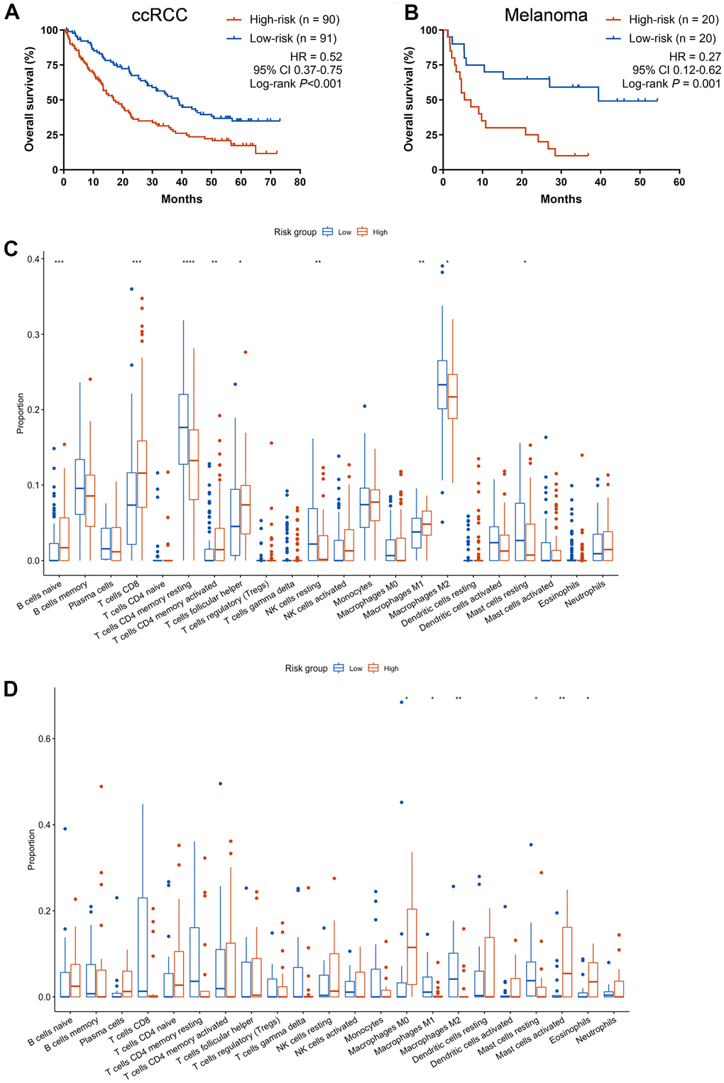 In order to further explore the immunotherapeutic predictive utility of CCCP risk score in other tumors, ccRCC and melanoma cohorts with patients treated with ICIs and available mRNA expression data were exploratively analyzed. In the ccRCC cohort, patients with low-risk score showed better OS than those with high-risk score (median OS, 38.6 vs 16.9 months; HR, 0.52, 95% CI 0.37-0.75, P< 0.001, Figure 4A). Similar results were noted in the melanoma cohort (median OS, 39.5 vs 6.2 months; HR, 0.27, 95% CI 0.12-0.62, P = 0.001, Figure 4B). Besides, we found that the proportion of macrophages M0, activated mast cells, and Eosinophils were higher in the high-risk group, while macrophages M1 and M2, and resting mast cells were higher in the low-risk group in melanoma cohort (Figure 4C). In the ccRCC cohort, the proportion of naive B cells, CD8+ T cells, activated CD4+ memory T cells, Tfh cells, and macrophages M1 were higher in the high-risk group, while resting CD4+ T memory cells, resting NK cells, macrophages M2, and resting mast cells were higher in the low-risk group (Figure 4D). Altogether, these results suggested that the high-risk group exhibited an immunosuppressive TME. The CCCP risk score is of potential predictive utility across different cancer patients treated with ICIs.