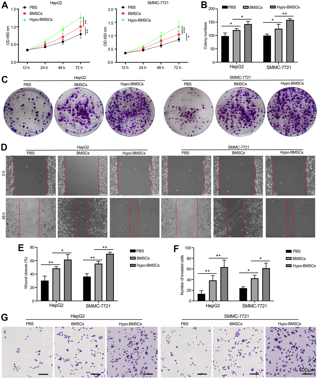 To explore the potential interactions between HCC and BMSCs, we first developed co-culture model. HepG2 cells and SMMC-7721 cancer cells line perform many differentiated hepatic functions and they with high proliferation rates, proliferation of HepG2 and SMMC-7721 cells as measured by CCK8 after co-culturing with BMSCs or hypo-BMSCs in 12h, 24h, 48h and 72h. As showed in Figure 1A, the proliferation levels are higher HepG2 and SMMC-7721 cells co-culture with hypo-BMSCs than BMSCs and control group, the result demonstrated that BMSCs or hypo-BMSCs co-culture promote HCC cells proliferation. Further, in colony formation assay, histogram (Figure 1B) shown that HepG2 and SMMC-7721 cells co-culture with hypo-BMSCs or BMSCs formed markedly more colonies than control group (Figure 1C). Next, the migration and invasion ability of cells were measured by wound healing (Figure 1D) and transwell assay (Figure 1G), respectively, after co-culturing with BMSCs or hypo-BMSCs. The data of histogram (Figure 1E, 1F) revealed that the migration or invasion ability of HepG2 and SMMC-7721 cells markedly increased in 48h compared with control.