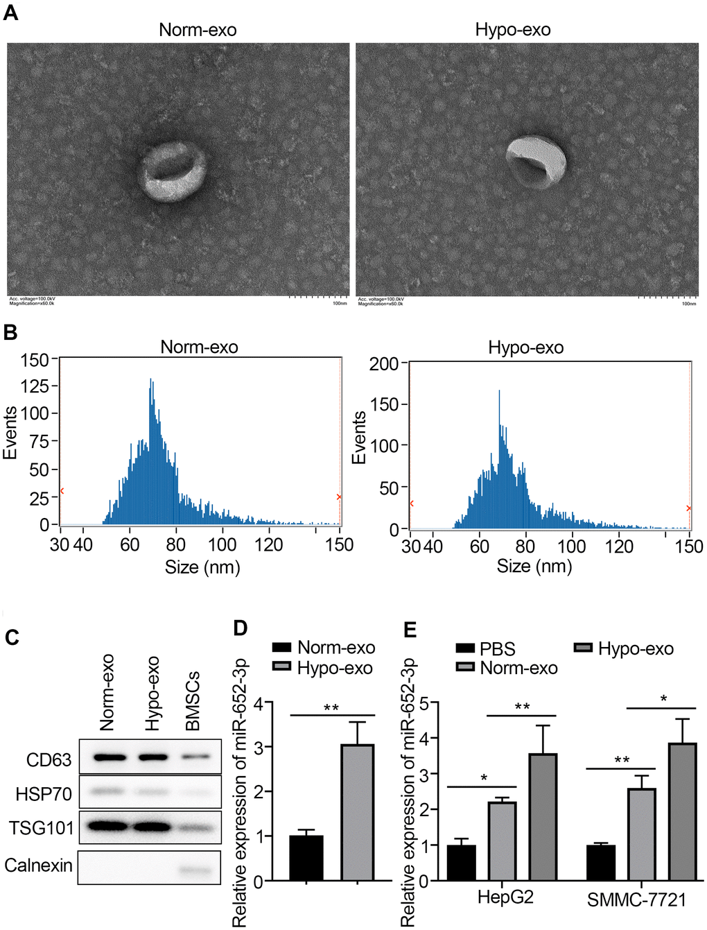 More and more evidence demonstrate that exosomes play an import role in facilitating tumorigenesis by regulating cancer microenvironment [16]. To elucidate underlying mechanism, we first isolate exosomes by procedures involving ultracentrifugation and quantify exosomes accurately by used the transmission electron microscopy (TEM) [17]. Exosomes isolated and purify from freshly-harvested supernatant of BMSCs or hypo-BMSCs culture, were evaluated by Western blots, NanoSight and TEM (Figure 2A). The ultracentrifuged, resuspended BMSC-derived exosomal appear in TEM has thus a characteristic well defined membrane-bound vesicles. Test of exosomes isolated from supernatant of hypo-BMSCs or normal cell cultural in the NanoSight instrument gave a broad peak corresponding to the mean particle size of 70 nm with the range of 50–150 nm (Figure 2B). Western blots were performed to determine the biomarkers of exosome (markers including CD63, HSP70, TSG101) in isolated BMSCs derived exosomes (Figure 2C). Interestingly, expression of miR-652-3p was detected in exosome derived from BMSCs under different conditions using qRT-PCR (Figure 2D). Further, high expression of miR-652-3p also was detected in HepG2 and SMMC-7721 after co-culturing with exosome derived from BMSCs under different conditions (Figure 2E).