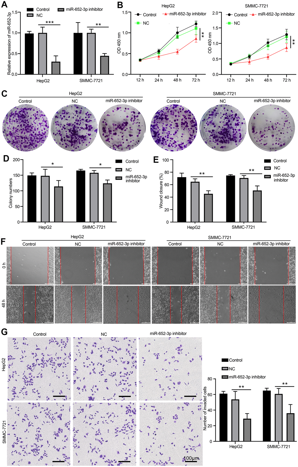 To further investigate the function underlying of miR-652-3p to promote proliferation and metastasis of HCC cells after co-culturing with BMSCs. After BMSCs by hypoxia condition treatment, exosome was isolated with hypo-BMSCs transfected with NC or miR-652-3p inhibitor, next HepG2 and SMMC-7721 cells were co-cultured with above exosome. The expression of miR-652-3p in HCC cells determined by qRT-PCR, the qRT-PCR analyses revealed that the expression of miR-652-3p is markedly reduced in miR-652-3p inhibitor group compared with NC and control (Figure 3A). As showed in Figure 3B, the proliferation levels of HepG2 and SMMC-7721 cells with miR-652-3p inhibitor are markedly lower than NC and control. After co-cultured with above exosome, next examination different ability of HepG2 and SMMC-7721 cells, such as Colony formation (Figure 3C, 3D), migration (Figure 3E, 3F) and invasion (Figure 3G), we confirmed that the proliferation and metastasis levels of HepG2 and SMMC-7721 cells with miR-652-3p inhibitor are markedly weaker than NC and control. In addition, the results indicate that overexpression of miR-652-3p inhibitor attenuates the proliferation and metastasis of HepG2 and SMMC-7721 cells after co-culturing with hypo-BMSCs.