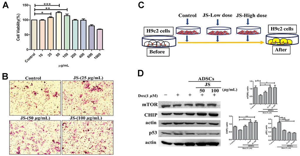 This method has been described in our previous report [28]. Briefly, hADSCs cultured in mesenPRO RSTM basal medium supplemented with mesenPRO RSTM growth factor supplement were seeded in the upper chamber of a hanging insert (Millipore, USA) and placed into the six-well culture plates containing H9c2 cells without contact to the lower chamber. H9c2 cells were cultured in six-well culture dishes. H9c2 cells cultured in Dulbecco’s Minimum Essential Medium containing 10% FBS with 1% penicillin-streptomycin were treated with Dox (1 μM), which was purchased from Sigma-Aldrich and diluted in dimethyl sulfoxide, for 24 h. After incubation for 24h, then cells were washed with PBS three times. The upper chamber with hADSCs preconditioned with JS was inserted into a 6-well dish for co-culture for 24 h. Finally, co-cultured H9c2 cells were washed with PBS three times and used for further experiments.