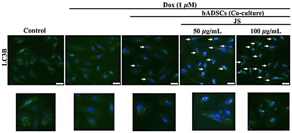 To evaluate the effect of JS on hADSC viability, we performed an MTT assay. The results indicated that after 24 h of treatment, hADSC viability increased under low doses of JS (25, 50, 100 μg/mL), whereas high doses (up to 800 μg/mL) exhibited low cytotoxicity (Figure 1A). Through transwell migration transwell migration assay to examine the effect of JS treatment on migration efficiency, we observed that hADSC migration increased in a dose-dependent manner at low dose concentrations of JS (Figure 1B). We consider JS contains various bioactive compounds that may regulate the microenvironment by stimulating cells to secrete soluble trophic factors that regulate stemness, through autocrine and paracrine mechanisms. To determine whether JS-preconditioned hADSCs exert a paracrine effect on Dox-challenged H9c2 cells, we performed a co-culture experiment, summarized in a schematic diagram (Figure 1C). The data from western blot analysis revealed that Dox-challenged H9c2 cells exhibited a decreased expression of mammalian target of rapamycin (mTOR) and carboxy terminus Hsp70-interacting protein (CHIP) protein, both of which regulate autophagic flux. Meanwhile, co-culture with hADSCs preconditioned with 50 or 100 μg/mL JS significantly upregulated mTOR and CHIP in H9c2 cells, while downregulating apoptosis marker p53 in a dose-dependent manner (Figure 1D). Similarly, the autophagic marker LC3B expression in Dox-challenged H9c2 cells was also exhibited lower expression. However, co-culture with hADSCs preconditioned with 50 or 100 μg/mL JS significantly induced the upregulated expression and aggregation of LC3B in Dox-challenged H9c2 cells (Figure 2). Because cells utilized autophagy to eliminates protein aggregates and damaged organelles, and by promoting bioenergetic homeostasis [41], these data suggest that JS-preconditioned hADSCs exert a cytoprotective effect to maintain a healthy cellular environment in Dox-challenged H9c2 cells through the stimulation of autophagic mechanism.
