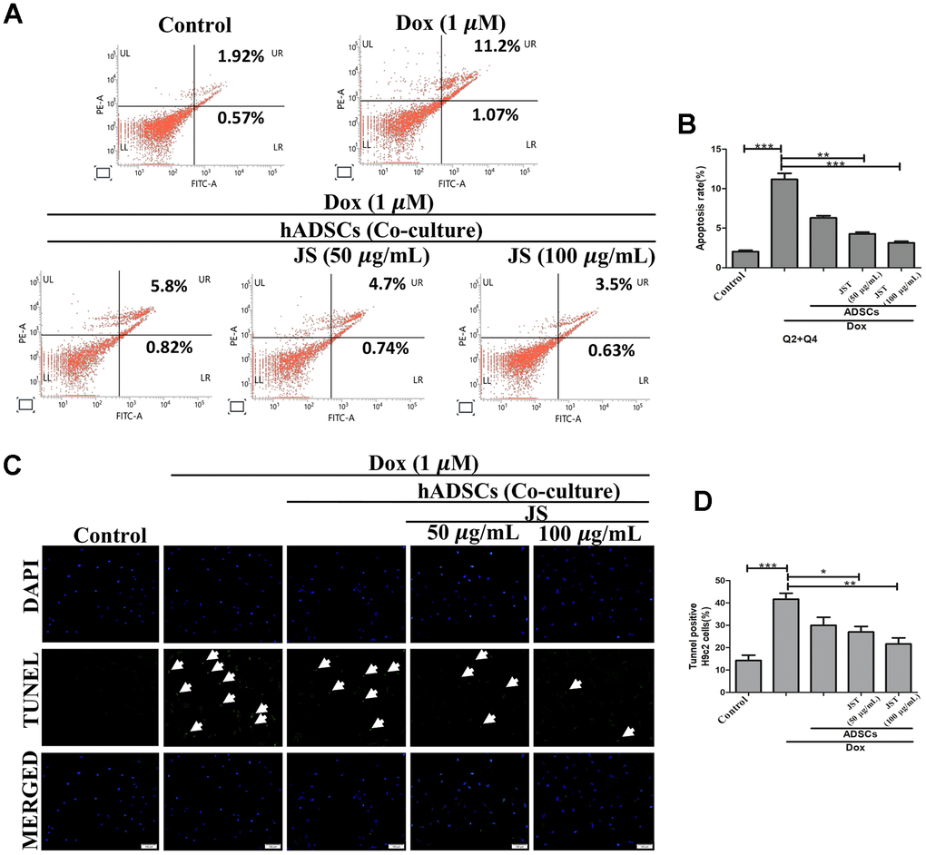 Several studies have reported that exposure to Dox promotes apoptosis in H9c2 cells [42, 43]. To examine whether JS-preconditioned hADSCs protects against Dox-induced apoptosis, we performed flow cytometry analyses of co-cultured H9c2 cells after Annexin V staining. After co-culture of JS-preconditioned hADSCs with H9c2 cells that were treated with Dox for 24 h, we determined the total proportion of apoptotic H9c2 cells by quantifying the number of cells undergoing late apoptosis (upper right quadrant; Q2) and early apoptosis (lower right quadrant; Q4). The apoptotic population was significantly reduced in a dose-dependent manner in Dox-challenged H9c2 cells co-cultured with JS-preconditioned hADSCs, as compared to that following co-culture with untreated ADSCs (Figure 3A, 3B). These data suggest that JS conditioning enhanced stem cell viability, thus maintaining a cytoprotective microenvironment, which helps nullify the cytotoxic effects of Dox exposure in H9c2 cells.
