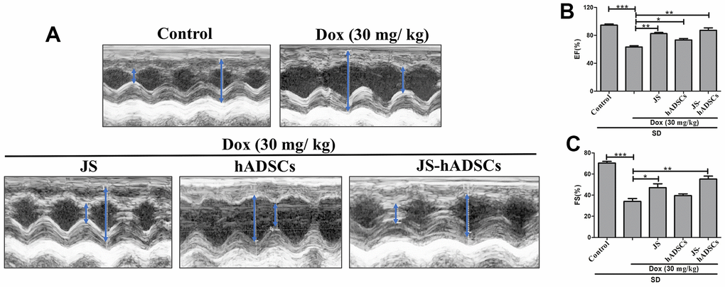 The results from our in vitro analysis showed that low dose JS enhanced the survival and migration of hADSC. Furthermore, JS-preconditioned hADSCs provide a suitable microenvironment that supports H9c2 cells in nullifying the detrimental effects of Dox. To validate these findings in an in vivo model, we next investigated whether JS-preconditioned hADSCs provide cardioprotective effects in Dox-challenged SD rats. Interestingly, we found that both JS and JS-preconditioned hADSCs provided cardioprotective effects to rats challenged with Dox, compared to the only Dox-treated group. The left ventricular internal diameter end diastole (LVIDd) and end systole (LVIDs) values of the JS groups showed a remarkable contractility function after the treatment, with the JS-preconditioned hADSCs exhibited a more pronounced favorable effect (Figure 5A). Similarly, the ejection fraction (EF%) and fractional shortening (FS%) also indicated a significant improvement in cardiac function following JS and JS-hADSC treatment (Figure 5B, 5C). Along with our in vitro results, these findings suggest that JS-preconditioned hADSCs could regulate mitochondrial ROS and suppress apoptosis to maintain cardiac function following Dox challenge in vivo.