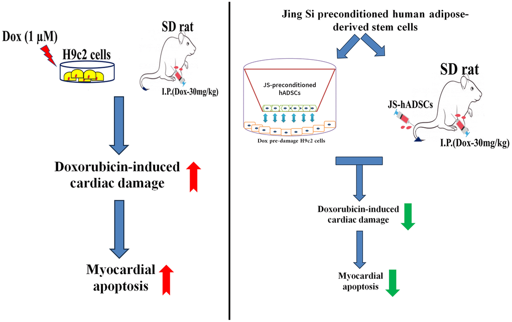 While Dox is an effective chemotherapeutic agent, its cardiotoxicity contributes to patient mortality. A limited number of studies have examined the effects of CHM on mesenchymal stem cell therapy for cardiac hypertrophy. While JS can promote stem cell homeostasis, there is no evidence to support whether it can enhance stem cell function. Therefore, we aimed to investigate whether JS could enhance the protective effects of ADSCs against Dox-induced cardiotoxicity in vitro and in vivo. We evaluated the effects of JS on human adipose-derived stem cells (hADSCs) via MTT and migration assays. Co-culture of hADSCs and H9c2 was followed by western blot, flow cytometry, TUNEL staining, immunoblot, F-actin staining, LC3B staining, and MitoSOX staining. For our in vivo study, Sprague-Dawley (SD) rats were subjected to M-mode echocardiography after receiving hADSCs. Our findings indicated that JS preconditioning improved the cardioprotective properties of stem cells against Dox, highlighting its value in regenerative therapy.