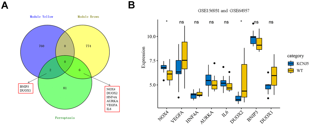 To screen the hub genes from all genes associated with clinical characteristics, the genes expression profile and clinical traits of patients with APA were combined to construct a gene co-expression network. Weighted gene co-expression network analysis (WGCNA) is a bioinformatic analysis that is used to investigate the relationships between genes and phenotypes efficiencies [41]. The clinical traits, including APA, age, gender, systolic blood pressure (SBP), diastolic blood pressure (DBP), serum K+ (K), plasma aldosterone (ALD), and plasma renin of APA as well as AAG samples were clustered and depicted on a heatmap (Figure 4A). When the soft threshold was set 8, the index of scale-free topological network was 0.9. Hence, the network was closer to the actual network (Figure 4B). The created gene dendrograms and corresponding module colors were drawn in Figure 4C. The genes were divided into 22 modules obtained from the visualized correlations between module eigengenes and clinical characteristics (Figure 4D). APA has a complex pathogenic mechanism of involving serum K+, plasma aldosterone and renin et al. Here, we took multiple clinicopathological factors into consideration and analyzed the correlation between each gene module. The APA, SBP and ALD of clinical characteristics were more positively relevant to the module yellow, and more negatively relevant to the module brown of all modules. Moreover, the most positive and negative correlation coefficient between APA and module yellow as well as brown were 0.85 and -0.78, respectively. This indicated that the genes in module yellow may contribute to the pathogenesis and development of APA, SBP and ALD. In contrast, the genes in module brown may repress the progression of APA, SBP and ALD. The hub genes were identified from the intersection of modules yellow and brown, along with that of ferroptosis-related DEGs (Figure 5A). Remarkably, IL6 and VEGFA were members of physical cores, whereas NOX4, DUOX1, DUOX2, and BNIP3 interacted with other genes in the combined core from PPI network (Figure 3B–3D). This suggested that these genes played an important role in the subnetworks.