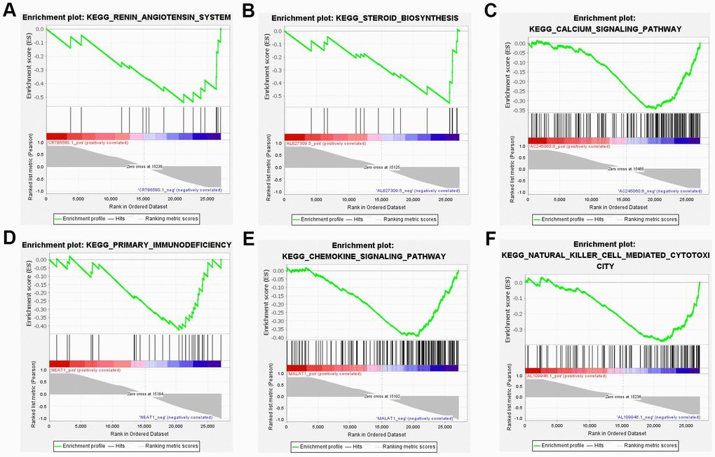 In contrast to the gene enrichment of functions and pathways, the top 10 DE lncRNAs enriched pathways that showed the highest degree of connection with GSEA were also analyzed. The results revealed the majority of 10 lncRNAs regulated immune and aldosterone-biosynthesis related pathway, such as the renin-angiotensin system, steroid biosynthesis, calcium signaling pathway, primary immunodeficiency, chemokine signaling pathway, and natural killer cell mediated cytotoxicity (Figure 7).
